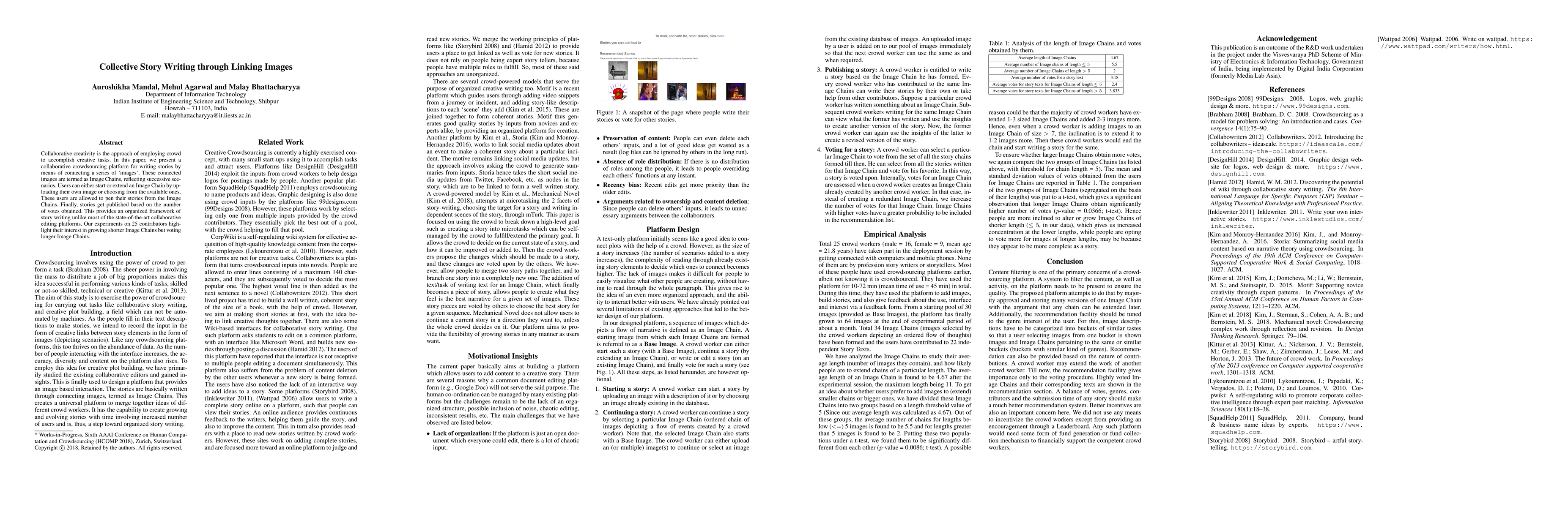 Collaborative creativity is the approach of employing crowd to accomplish creative tasks. In this paper, we present a collaborative crowdsourcing platform for writing stories by means of connecting a series of `images'. These connected images are termed as Image Chains, reflecting successive scenarios. Users can either start or extend an Image Chain by uploading their own image or choosing from the available ones. These users are allowed to pen their stories from the Image Chains. Finally, stories get published based on the number of votes obtained. This provides an organized framework of story writing unlike most of the state-of-the-art collaborative editing platforms. Our experiments on 25 contributors highlight their interest in growing shorter Image Chains but voting longer Image Chains.