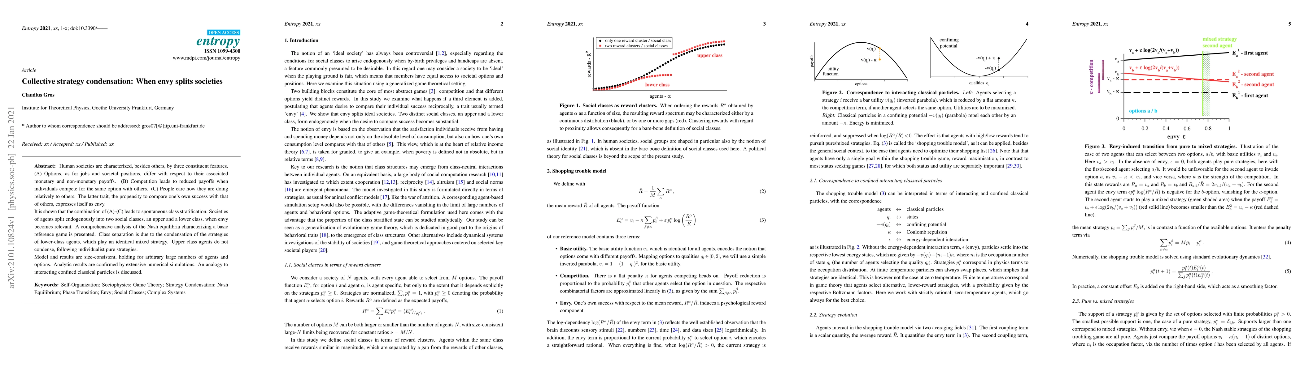 Human societies are characterized, besides others, by three constituent features. (A) Options, as for jobs and societal positions, differ with respect to their associated monetary and non-monetary payoffs. (B) Competition leads to reduced payoffs when individuals compete for the same option with others. (C) People care how they are doing relatively to others. The latter trait, the propensity to compare one's own success with that of others, expresses itself as envy. It is shown that the combination of (A)-(C) leads to spontaneous class stratification. Societies of agents split endogenously into two social classes, an upper and a lower class, when envy becomes relevant. A comprehensive analysis of the Nash equilibria characterizing a basic reference game is presented. Class separation is due to the condensation of the strategies of lower-class agents, which play an identical mixed strategy. Upper class agents do not condense, following individualist pure strategies. Model and results are size-consistent, holding for arbitrary large numbers of agents and options. Analytic results are confirmed by extensive numerical simulations. An analogy to interacting confined classical particles is discussed.