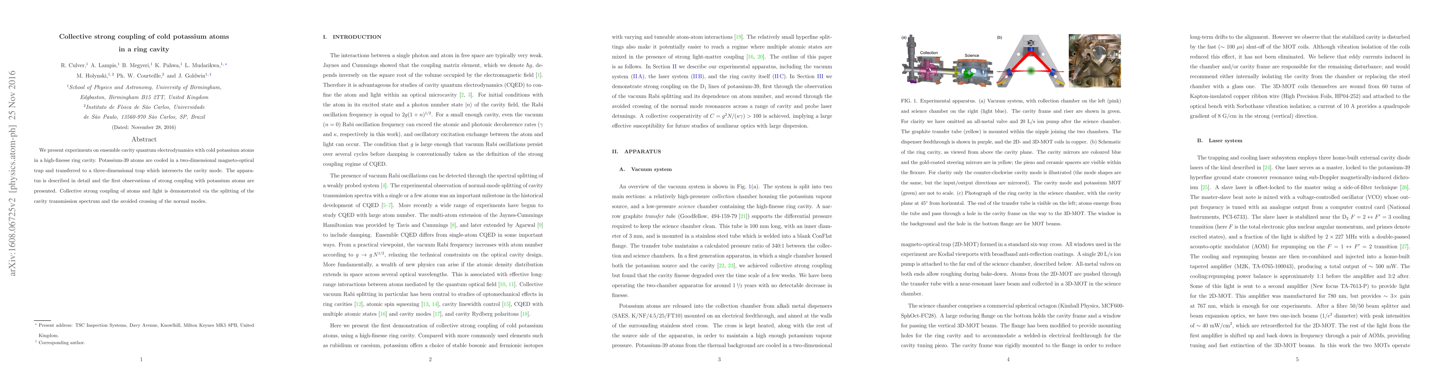 This research demonstrates strong coupling between cold potassium atoms and a high-finesse ring cavity, achieving collective strong coupling evidenced by cavity transmission spectrum splitting and normal mode avoided crossing. The potassium atoms are precisely cooled and aligned with the cavity mode.