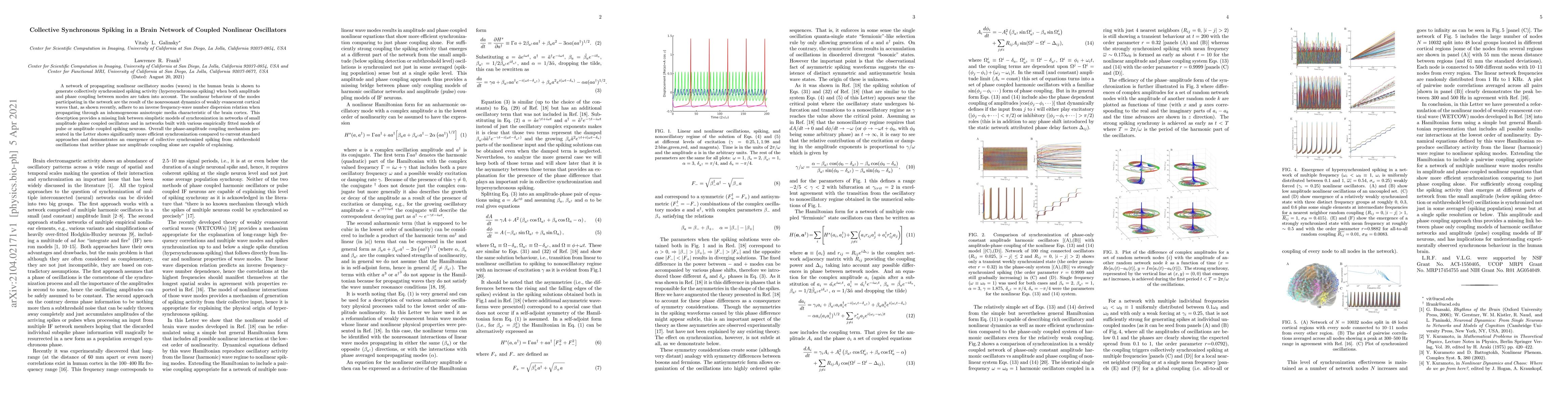 A network of propagating nonlinear oscillatory modes (waves) in the human brain is shown to generate collectively synchronized spiking activity (hypersynchronous spiking) when both amplitude and phase coupling between modes are taken into account. The nonlinear behavior of the modes participating in the network are the result of the nonresonant dynamics of weakly evanescent cortical waves that, as shown recently, adhere to an inverse frequency-wave number dispersion relation when propagating through an inhomogeneous anisotropic media characteristic of the brain cortex. This description provides a missing link between simplistic models of synchronization in networks of small amplitude phase coupled oscillators and in networks built with various empirically fitted models of pulse or amplitude coupled spiking neurons. Overall the phase-amplitude coupling mechanism presented in the Letter shows significantly more efficient synchronization compared to current standard approaches and demonstrates an emergence of collective synchronized spiking from subthreshold oscillations that neither phase nor amplitude coupling alone are capable of explaining.