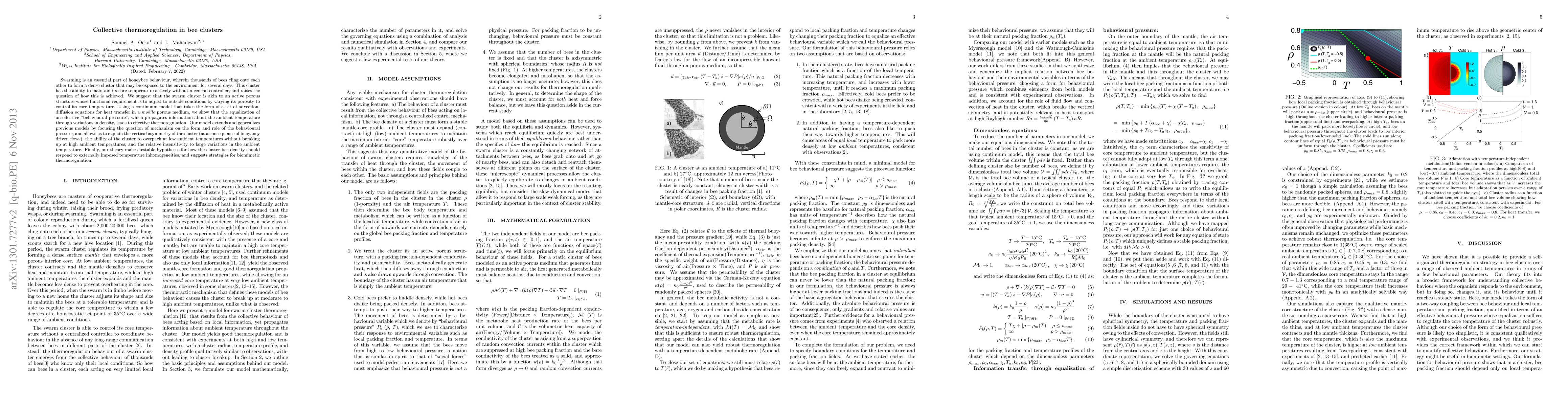 The research proposes a model comparing honeybee swarm clusters to active porous structures, explaining their temperature regulation. Using advection-diffusion equations, it highlights 'behavioural pressure' as the key mechanism, accounting for cluster's vertical asymmetry, overpacking at low temps, and resilience at high temps. The theory provides testable hypotheses for density responses to temperature variations, suggesting biomimicry strategies.