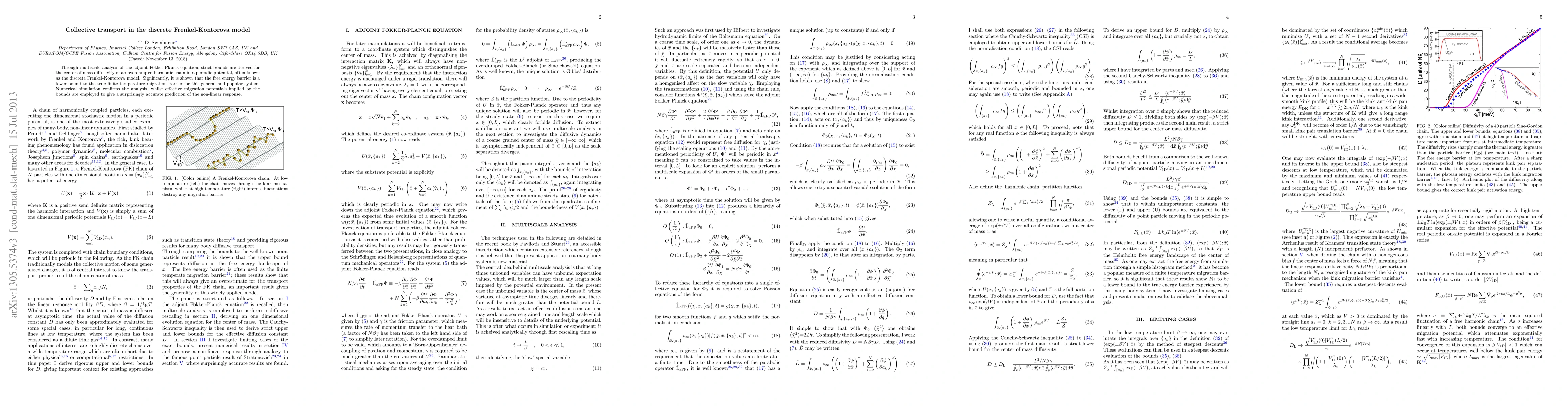 Researchers derived strict bounds for the center of mass diffusivity in a discrete Frenkel-Kontorova model, showing that a free energy barrier serves as a lower bound to the true finite temperature migration barrier, with numerical simulations confirming the findings.