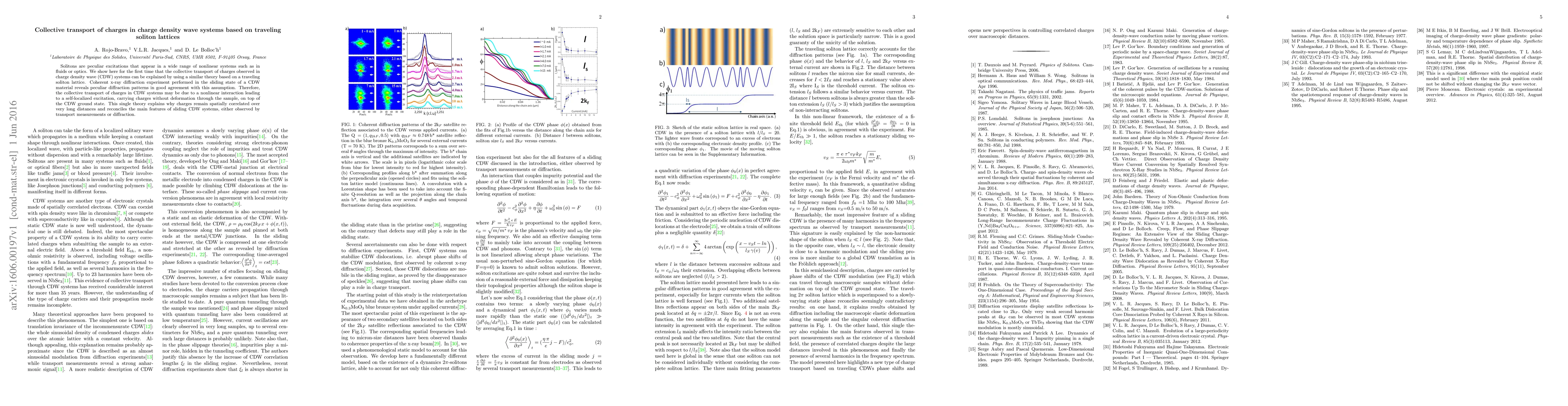 Solitons are peculiar excitations that appear in a wide range of nonlinear systems such as in fluids or optics. We show here that the collective transport of charges observed in charge density wave (CDW) systems can be explained by using a similar theory based on a traveling soliton lattice. Coherent x-ray diffraction experiment performed in the sliding state of a CDW material reveals peculiar diffraction patterns in good agreement with this assumption. Therefore, the collective transport of charges in CDW systems may be due to a nonlinear interaction leading to a self-localized excitation, carrying charges without deformation through the sample, on top of the CDW ground state. This single theory explains why charges remain spatially correlated over very long distances and reconciles the main features of sliding CDW systems, either observed by transport measurements or diffraction.