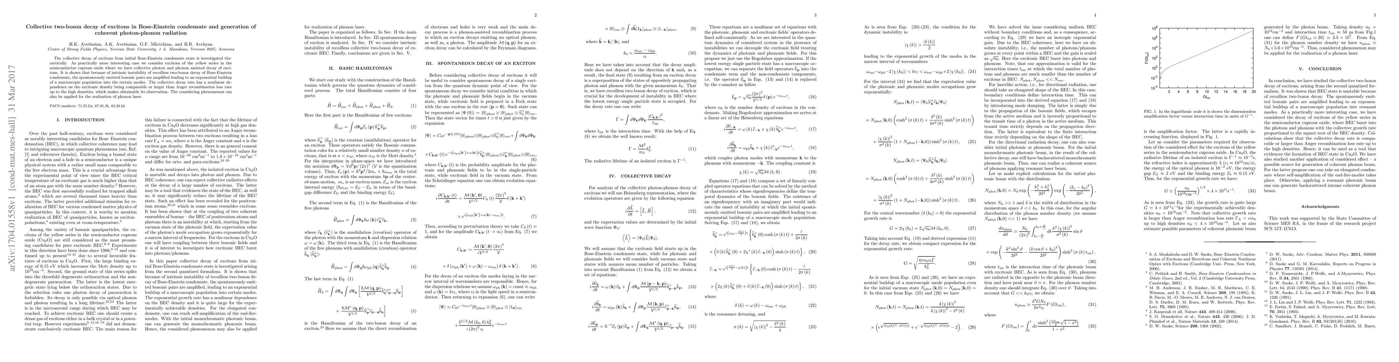 This paper investigates the theoretical framework for the collective decay of excitons in a Bose-Einstein condensate, focusing on the yellow series excitons in cuprous oxide. It demonstrates the generation of coherent photon-phonon radiation through spontaneous amplification of bosonic pairs, leading to a nonlinear decay rate and potential phonon laser applications.