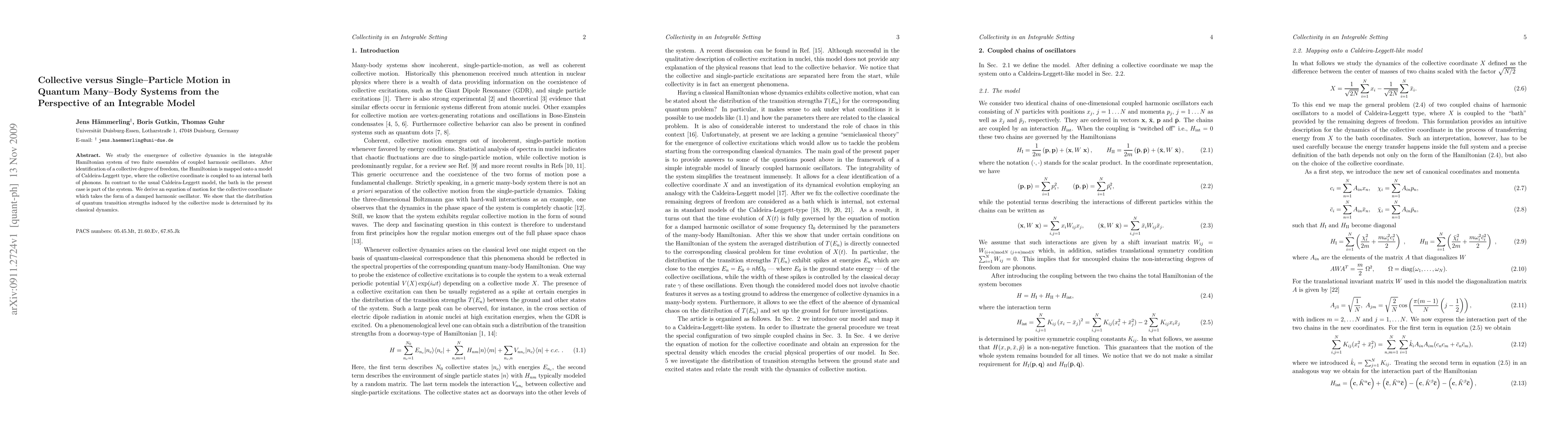 We study the emergence of collective dynamics in the integrable Hamiltonian system of two finite ensembles of coupled harmonic oscillators. After identification of a collective degree of freedom, the Hamiltonian is mapped onto a model of Caldeira-Leggett type, where the collective coordinate is coupled to an internal bath of phonons. In contrast to the usual Caldeira-Leggett model, the bath in the present case is part of the system. We derive an equation of motion for the collective coordinate which takes the form of a damped harmonic oscillator. We show that the distribution of quantum transition strengths induced by the collective mode is determined by its classical dynamics.