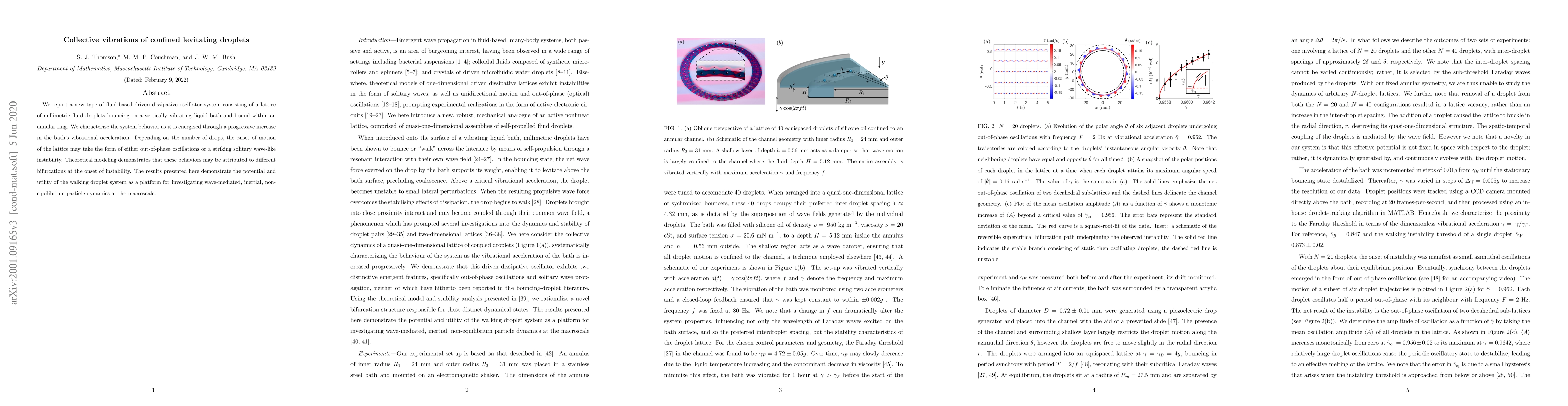 We report a new type of fluid-based driven dissipative oscillator system consisting of a lattice of millimetric fluid droplets bouncing on a vertically vibrating liquid bath and bound within an annular ring. We characterize the system behavior as it is energized through a progressive increase in the bath's vibrational acceleration. Depending on the number of drops, the onset of motion of the lattice may take the form of either out-of-phase oscillations or a striking solitary wave-like instability. Theoretical modeling demonstrates that these behaviors may be attributed to different bifurcations at the onset of instability. The results presented here demonstrate the potential and utility of the walking droplet system as a platform for investigating wave-mediated, inertial, non-equilibrium particle dynamics at the macroscale.