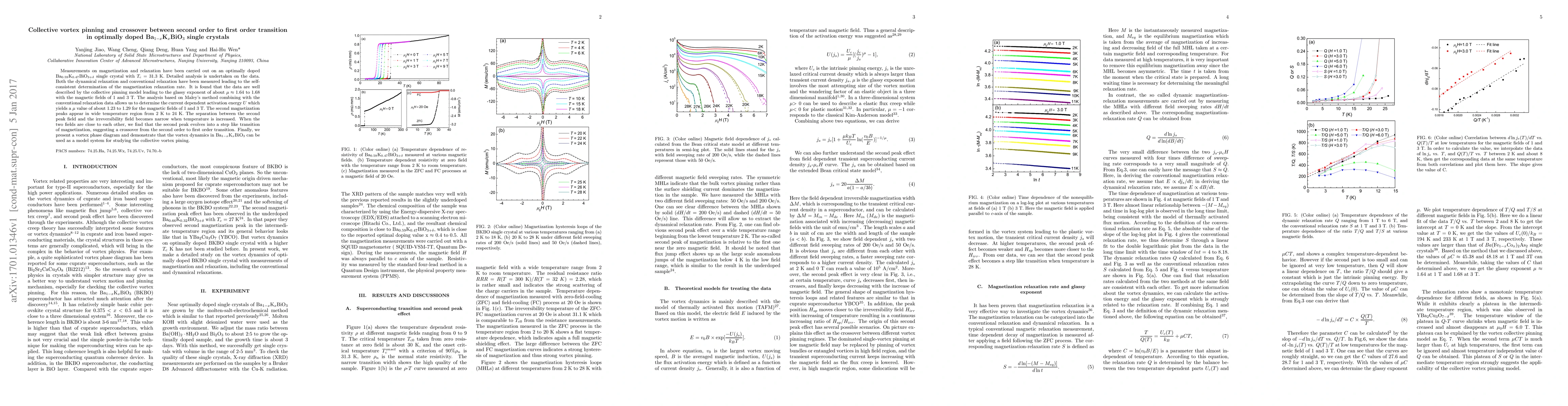 Measurements on magnetization and relaxation have been carried out on an optimally doped Ba$_{0.59}$K$_{0.47}$BiO$_{3+\delta}$ single crystal with $T_c$ = 31.3 K. Detailed analysis is undertaken on the data. Both the dynamical relaxation and conventional relaxation have been measured leading to the self-consistent determination of the magnetization relaxation rate. It is found that the data are well described by the collective pinning model leading to the glassy exponent of about $\mu\approx$ 1.64 to 1.68 with the magnetic fields of 1 and 3 T. The analysis based on Maley's method combining with the conventional relaxation data allows us to determine the current dependent activation energy $U$ which yields a $\mu$ value of about 1.23 to 1.29 for the magnetic fields of 1 and 3 T. The second magnetization peaks appear in wide temperature region from 2 K to 24 K. The separation between the second peak field and the irreversibility field becomes narrow when temperature is increased. When the two fields are close to each other, we find that the second peak evolves into a step like transition of magnetization, suggesting a crossover from the second order to first order transition. Finally, we present a vortex phase diagram and demonstrate that the vortex dynamics in Ba$_{1-x}$K$_x$BiO$_3$ can be used as a model system for studying the collective vortex pining.