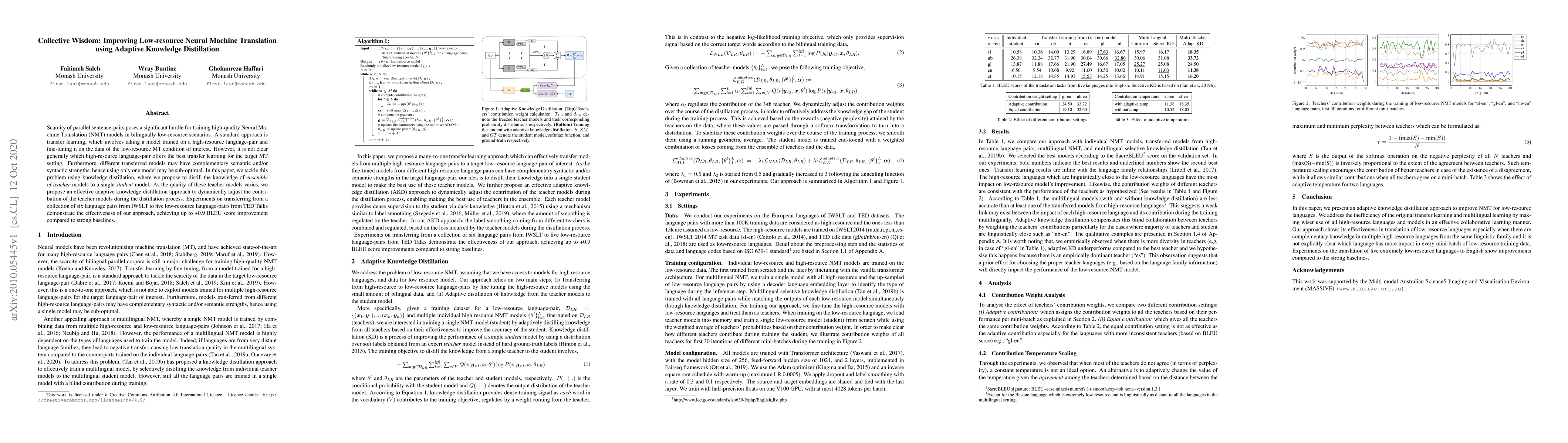 This paper proposes an adaptive knowledge distillation method to improve Neural Machine Translation (NMT) in low-resource settings by distilling knowledge from an ensemble of teacher models. It dynamically adjusts the contribution of each teacher model, achieving up to a +0.9 BLEU score improvement over strong baselines in experiments transferring from high-resource to low-resource language pairs.