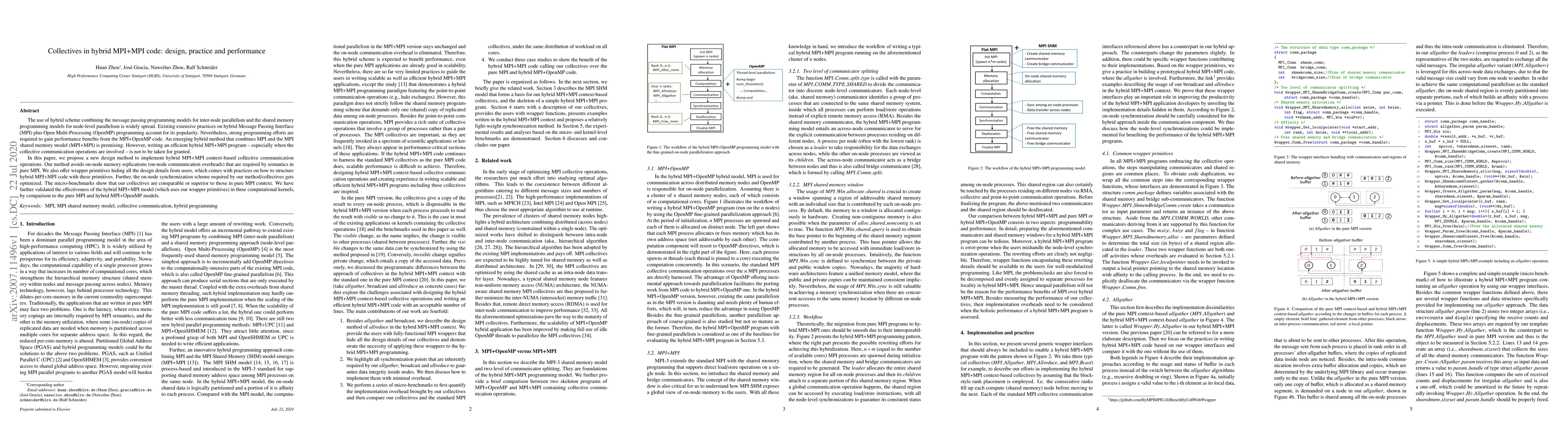 This paper proposes a new design method for efficient hybrid MPI+MPI collective communication, avoiding on-node memory replications and offering user-friendly wrapper primitives. Performance benchmarks indicate that the proposed method is comparable or superior to pure MPI collectives, validated through computational kernels against pure MPI and hybrid MPI+OpenMP models.
