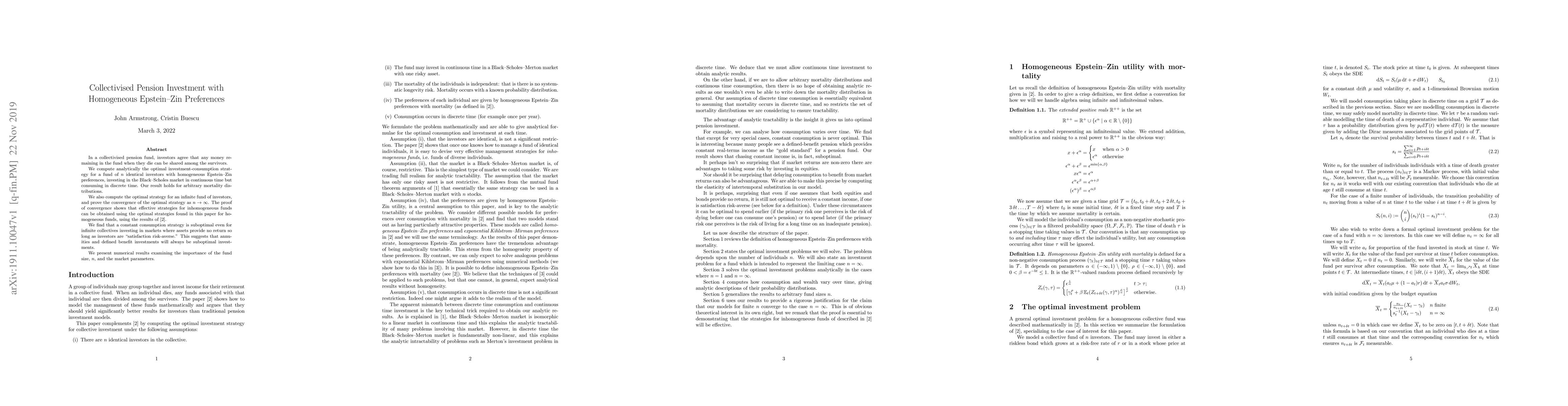 In a collectivised pension fund, investors agree that any money remaining in the fund when they die can be shared among the survivors. We compute analytically the optimal investment-consumption strategy for a fund of $n$ identical investors with homogeneous Epstein--Zin preferences, investing in the Black--Scholes market in continuous time but consuming in discrete time. Our result holds for arbitrary mortality distributions. We also compute the optimal strategy for an infinite fund of investors, and prove the convergence of the optimal strategy as $n\to \infty$. The proof of convergence shows that effective strategies for inhomogeneous funds can be obtained using the optimal strategies found in this paper for homogeneous funds, using the results of [2]. We find that a constant consumption strategy is suboptimal even for infinite collectives investing in markets where assets provide no return so long as investors are "satisfaction risk-averse." This suggests that annuities and defined benefit investments will always be suboptimal investments. We present numerical results examining the importance of the fund size, $n$, and the market parameters.