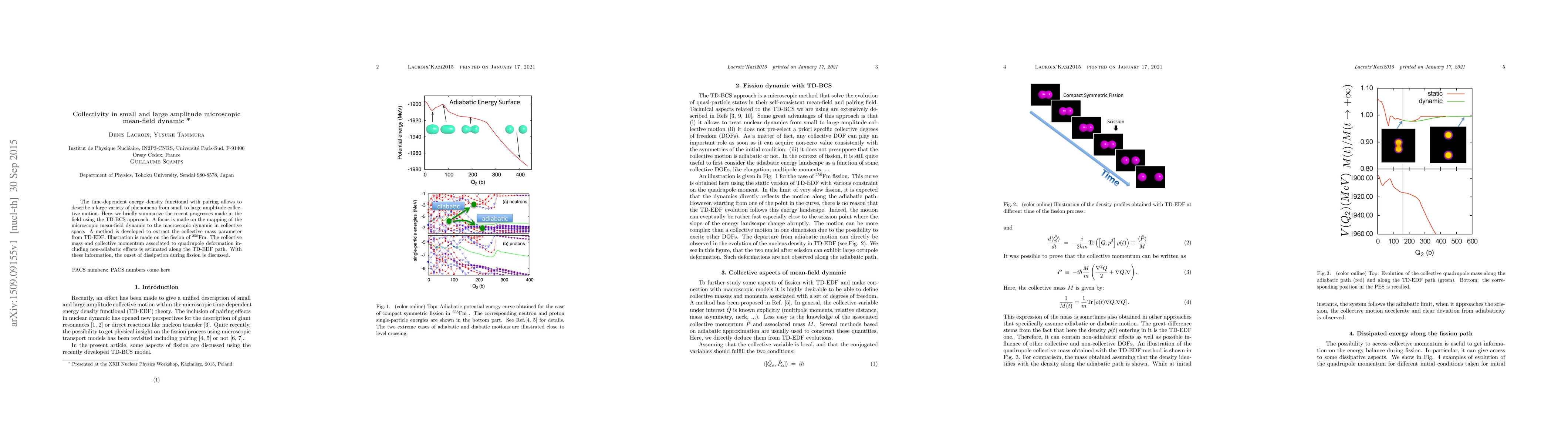 This paper summarizes recent advancements in describing collective motion using the time-dependent BCS approach, focusing on mapping microscopic mean-field dynamics to macroscopic collective dynamics. It introduces a method to extract collective mass parameters and applies it to the fission of $^{258}$Fm, discussing the onset of dissipation during the process.