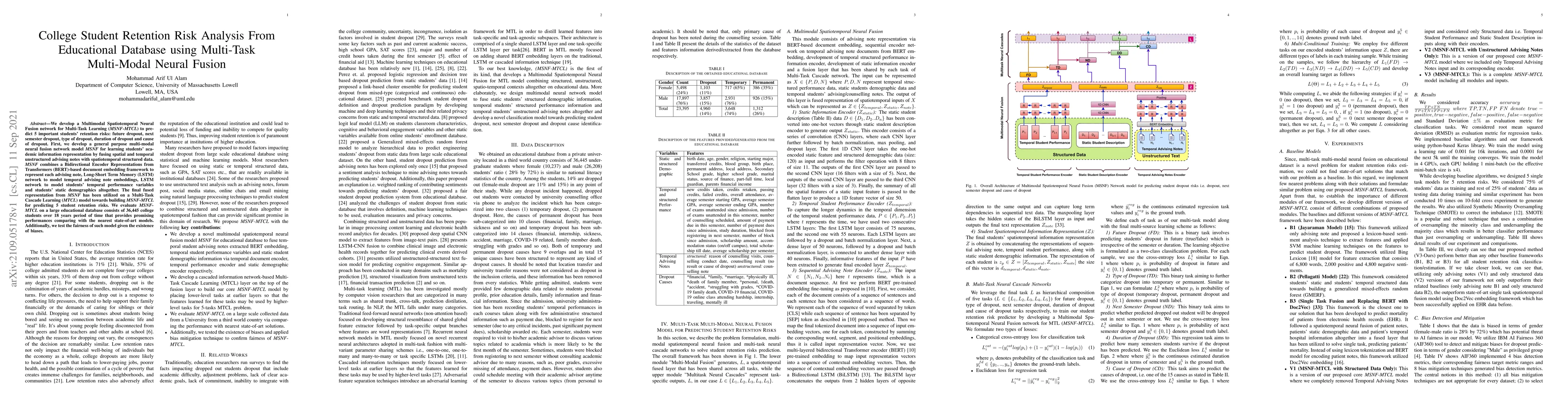 We develop a Multimodal Spatiotemporal Neural Fusion network for Multi-Task Learning (MSNF-MTCL) to predict 5 important students' retention risks: future dropout, next semester dropout, type of dropout, duration of dropout and cause of dropout. First, we develop a general purpose multi-modal neural fusion network model MSNF for learning students' academic information representation by fusing spatial and temporal unstructured advising notes with spatiotemporal structured data. MSNF combines a Bidirectional Encoder Representations from Transformers (BERT)-based document embedding framework to represent each advising note, Long-Short Term Memory (LSTM) network to model temporal advising note embeddings, LSTM network to model students' temporal performance variables and students' static demographics altogether. The final fused representation from MSNF has been utilized on a Multi-Task Cascade Learning (MTCL) model towards building MSNF-MTCL for predicting 5 student retention risks. We evaluate MSNFMTCL on a large educational database consists of 36,445 college students over 18 years period of time that provides promising performances comparing with the nearest state-of-art models. Additionally, we test the fairness of such model given the existence of biases.