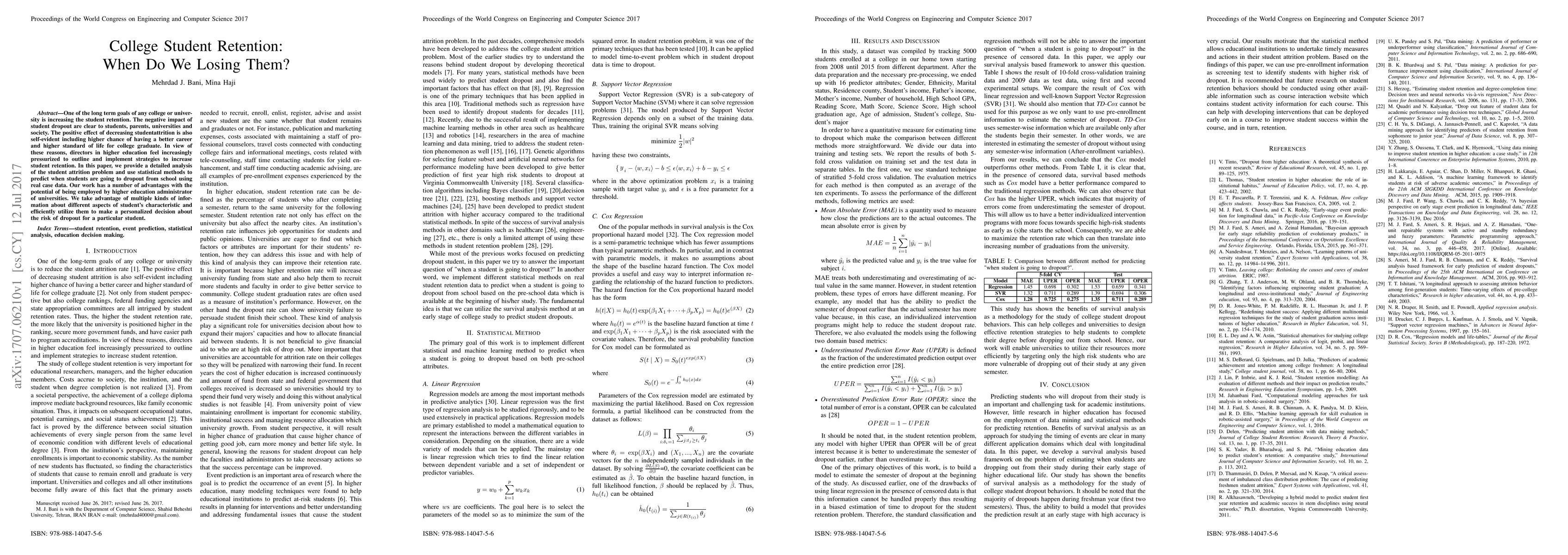 This research paper analyzes student attrition and predicts when students are likely to drop out using statistical methods and real case data. It aims to provide personalized insights for higher education administrators to improve college student retention.