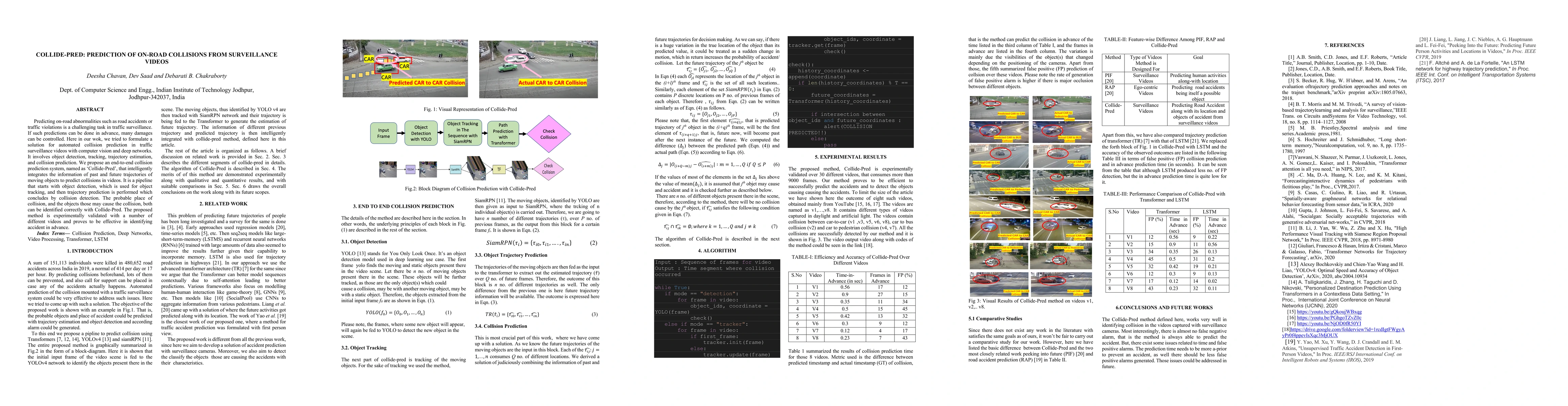 COLLIDE-PRED is an end-to-end system for predicting on-road collisions using surveillance videos, integrating object detection, tracking, and trajectory estimation to foresee potential accidents. The method was validated experimentally and demonstrated effectiveness in identifying collision risks in advance.