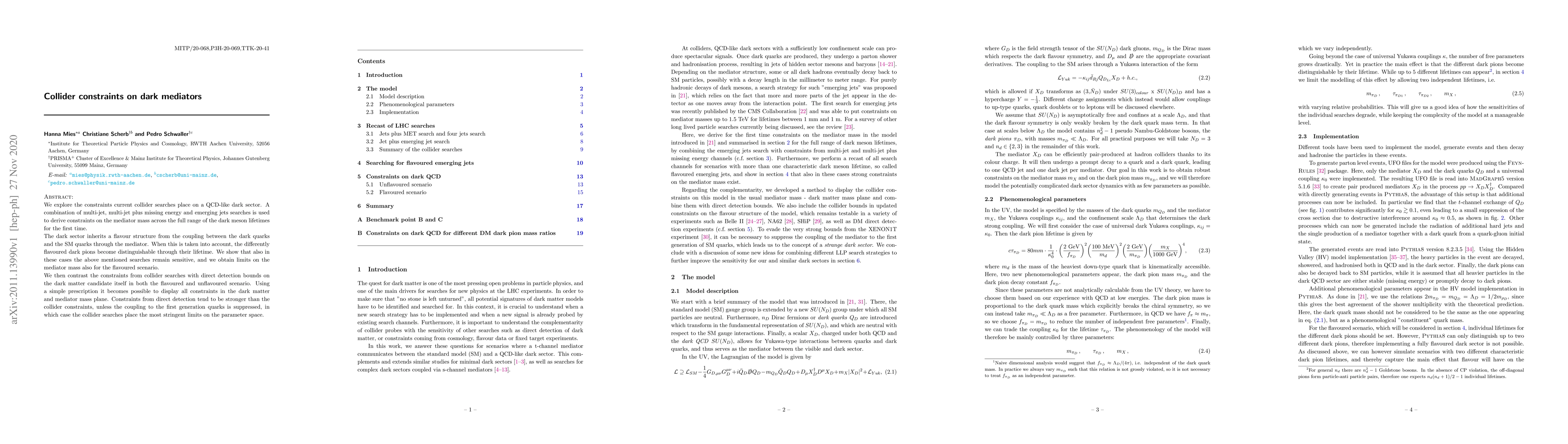 This paper examines the constraints on dark mediators from current collider searches, combining multi-jet, multi-jet plus missing energy, and emerging jets analyses. It finds that collider constraints remain effective even when considering a flavoured dark sector, providing limits on mediator mass across various dark meson lifetimes. The study contrasts these collider constraints with direct detection bounds, showing that direct detection generally imposes stronger limits unless the coupling to first-generation quarks is suppressed.