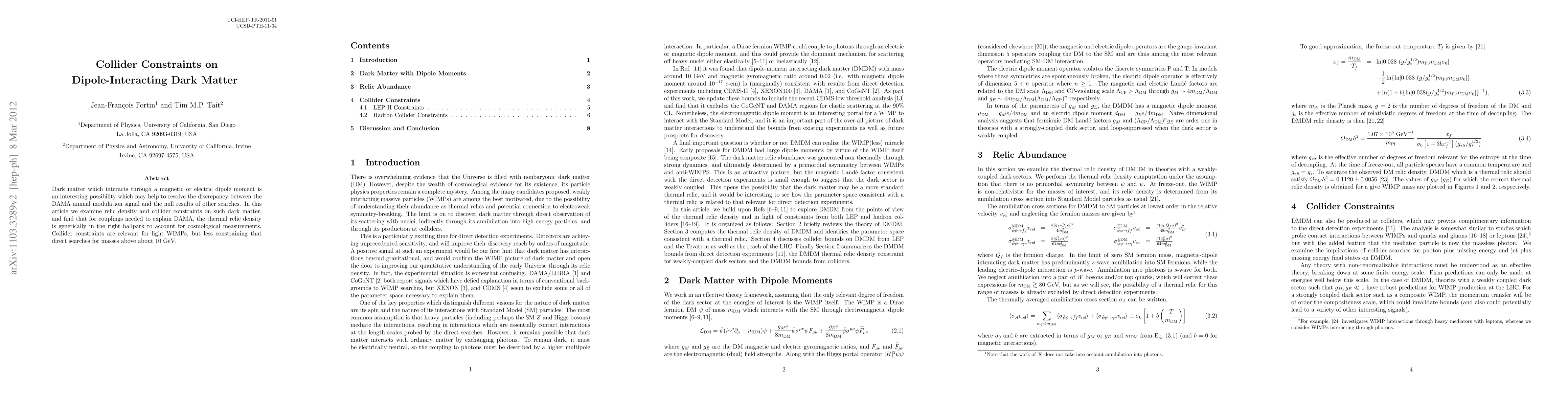 This paper investigates dark matter interacting via dipole moments, exploring its relic density and collider constraints. It finds that such dark matter can explain the DAMA signal while maintaining a viable thermal relic density, with collider constraints being significant for light WIMPs but less so for those above 10 GeV.