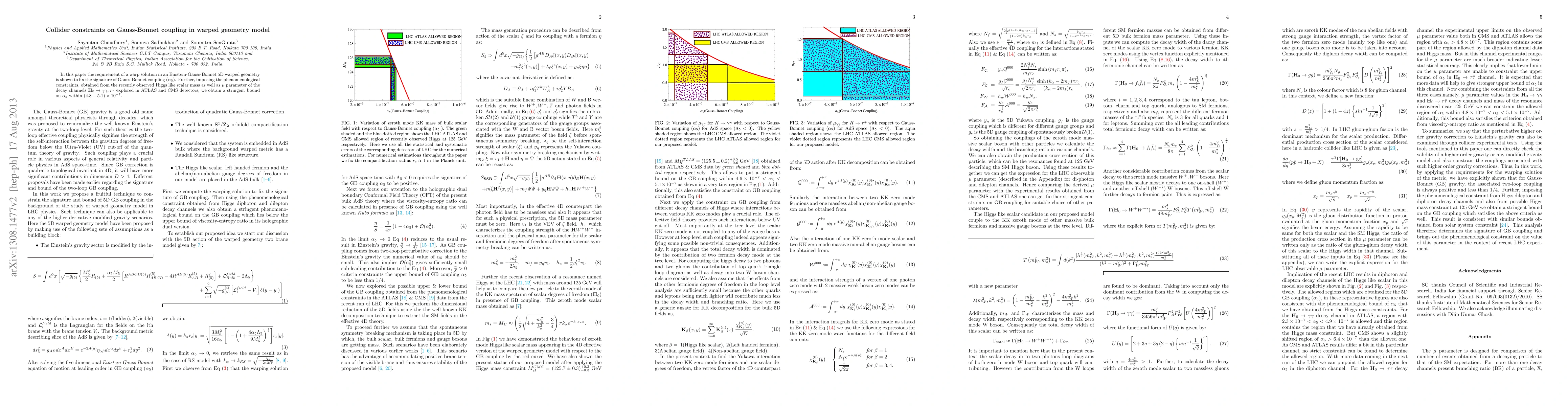 In this paper the requirement of a warp solution in an Einstein-Gauss-Bonnet 5D warped geometry is shown to fix the signature of Gauss-Bonnet coupling ($\alpha_{5}$). Further, imposing the phenomenological constraints, obtained from the recently observed Higgs like scalar mass as well as $\mu$ parameter of the decay channels ${H}_{0}\rightarrow\gamma\gamma,\tau{\bar \tau}$ explored in ATLAS and CMS detectors, we obtain a stringent bound on $\alpha_{5}$ within $(4.8 - 5.1)\times 10^{-7}$.