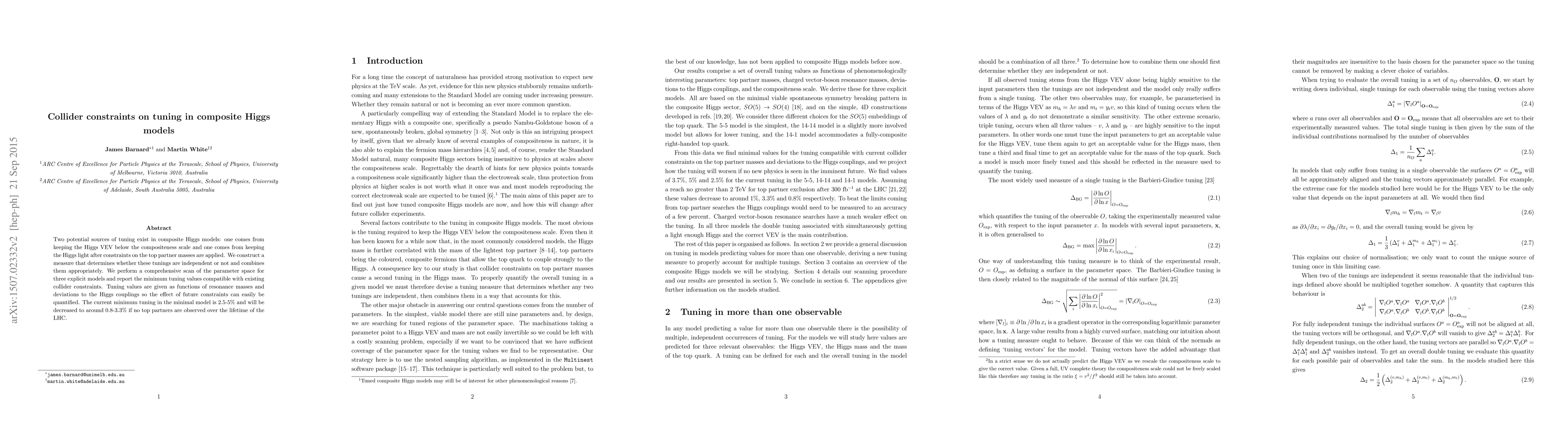 This paper examines tuning in composite Higgs models, identifying two sources of tuning related to the Higgs VEV and mass. It constructs a measure to assess the independence of these tunings and performs a detailed scan of three models, reporting minimum tuning values under collider constraints. The current minimum tuning is 2.5-5%, expected to reduce to 0.8-3.3% if no top partners are detected by the LHC.