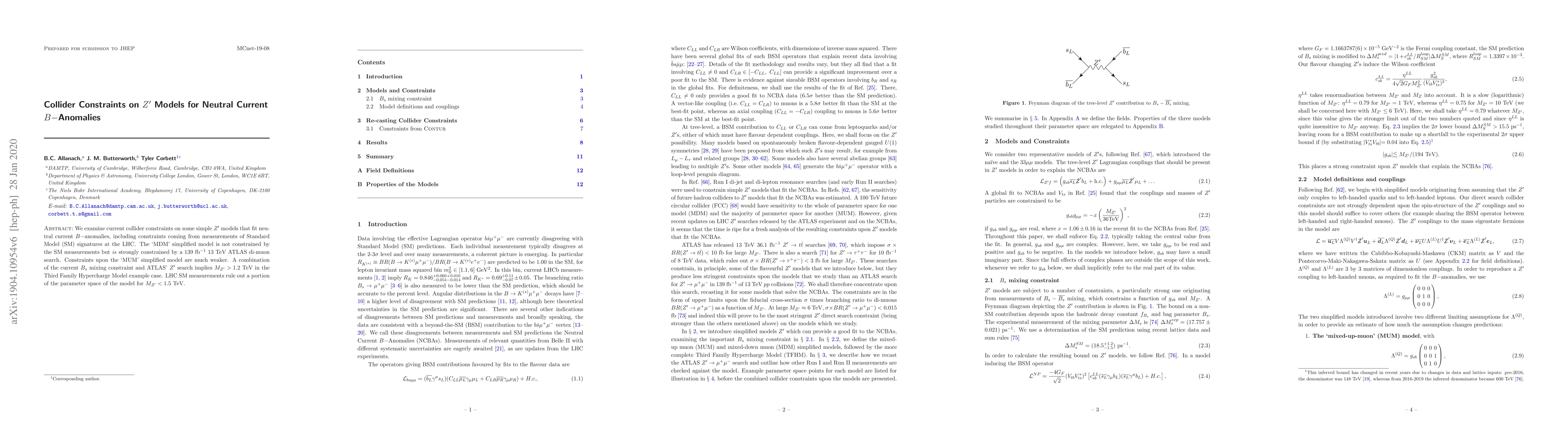 We examine current collider constraints on some simple $Z^\prime$ models that fit neutral current $B-$anomalies, including constraints coming from measurements of Standard Model (SM) signatures at the LHC. The `MDM' simplified model is not constrained by the SM measurements but {\em is} strongly constrained by a 139 fb$^{-1}$ 13 TeV ATLAS di-muon search. Constraints upon the `MUM' simplified model are much weaker. A combination of the current $B_s$ mixing constraint and ATLAS' $Z^\prime$ search implies $M_{Z^\prime}>1.2$ TeV in the Third Family Hypercharge Model example case. LHC SM measurements rule out a portion of the parameter space of the model for $M_{Z^\prime}<1.5$ TeV.