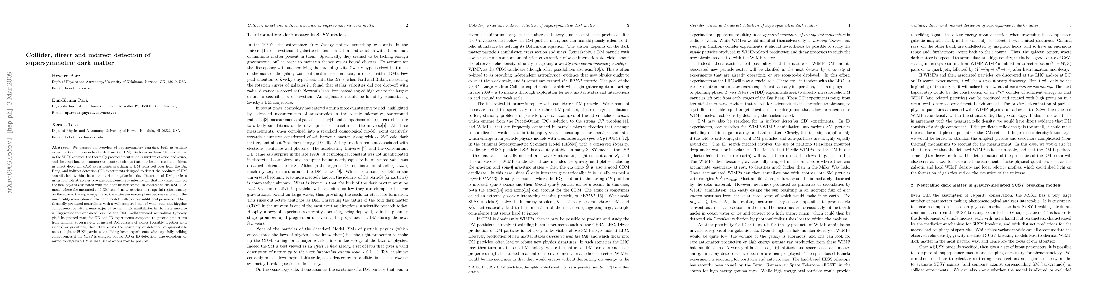 We present an overview of supersymmetry searches, both at collider experiments and via searches for dark matter (DM). We focus on three DM possibilities in the SUSY context: the thermally produced neutralino, a mixture of axion and axino, and the gravitino, and compare and contrast signals that may be expected at colliders, in direct detection (DD) experiments searching of DM relics left over from the Big Bang, and indirect detection (ID) experiments designed to detect the products of DM annihilations within the solar interior or galactic halo. Detection of DM particles using multiple strategies provides complementary information that may shed light on the new physics associated with the dark matter sector. In contrast to the mSUGRA model where the measured cold DM relic density restricts us to special regions mostly on the edge of the m_0-m_{1/2} plane, the entire parameter plane becomes allowed if the universality assumption is relaxed in models with just one additional parameter. Then, thermally produced neutralinos with a well-tempered mix of wino, bino and higgsino components, or with a mass adjusted so that their annihilation in the early universe is Higgs-resonance-enhanced, can be the DM. Well-tempered neutralinos typically yield heightened rates for DD and ID experiments compared to generic predictions from minimal supergravity. If instead DM consists of axinos (possibly together with axions) or gravitinos, then there exists the possibility of detection of quasi-stable next-to-lightest SUSY particles at colliding beam experiments, with especially striking consequences if the NLSP is charged, but no DD or ID detection. The exception for mixed axion/axino DM is that DD of axions may be possible.