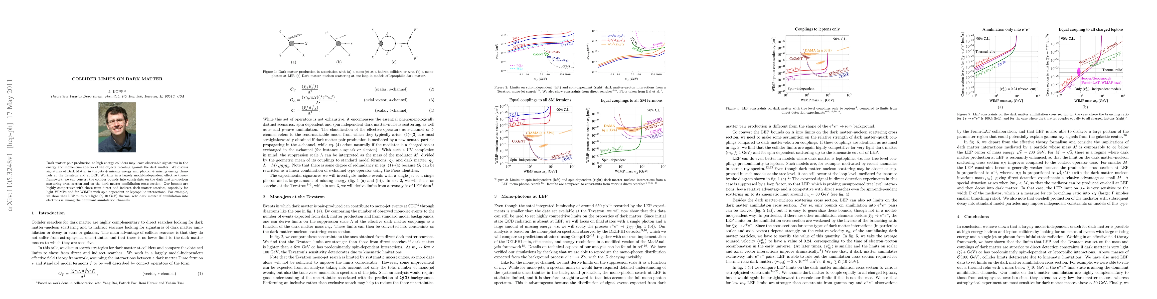 This paper investigates dark matter signatures at high energy colliders like the Tevatron and LEP, focusing on the jets + missing energy and photon + missing energy channels. It establishes competitive collider limits on dark matter-nucleon scattering and annihilation cross sections, particularly for light WIMPs and those with specific interactions, ruling out light (<~ 10 GeV) thermal relic dark matter annihilating into electrons.