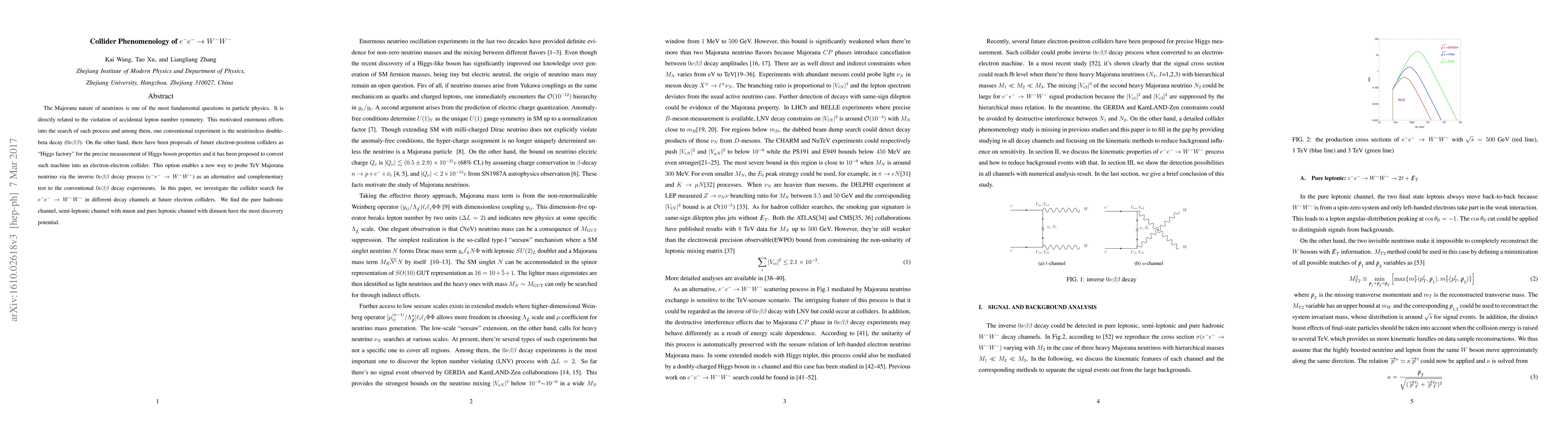 This paper explores the collider phenomenology of the process $e^{-}e^{-}\to W^{-}W^{-}$ at future electron colliders, proposing it as an alternative method to test for the existence of Majorana neutrinos, complementary to neutrinoless double-beta decay experiments. The study finds that the pure hadronic, semi-leptonic with muon, and pure leptonic with muon channels offer the highest discovery potential.