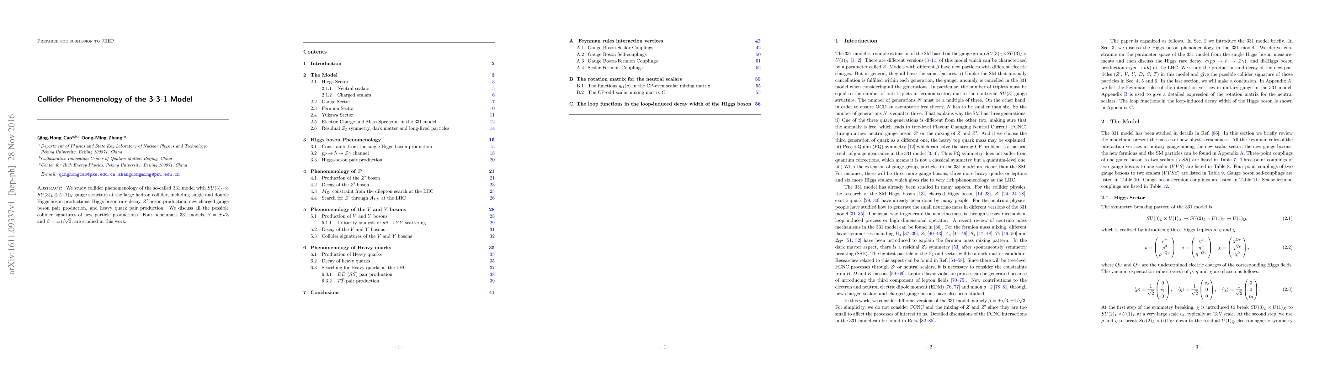 We study collider phenomenology of the so-called 331 model with $SU(3)_C\otimes SU(3)_L\otimes U(1)_X$ gauge structure at the large hadron collider, including single and double Higgs boson productions, Higgs boson rare decay, $Z^\prime$ boson production, new charged gauge boson pair production, and heavy quark pair production. We discuss all the possible collider signatures of new particle productions. Four benchmark 331 models, $\beta=\pm \sqrt{3}$ and $\beta=\pm 1/\sqrt{3}$, are studied in this work.