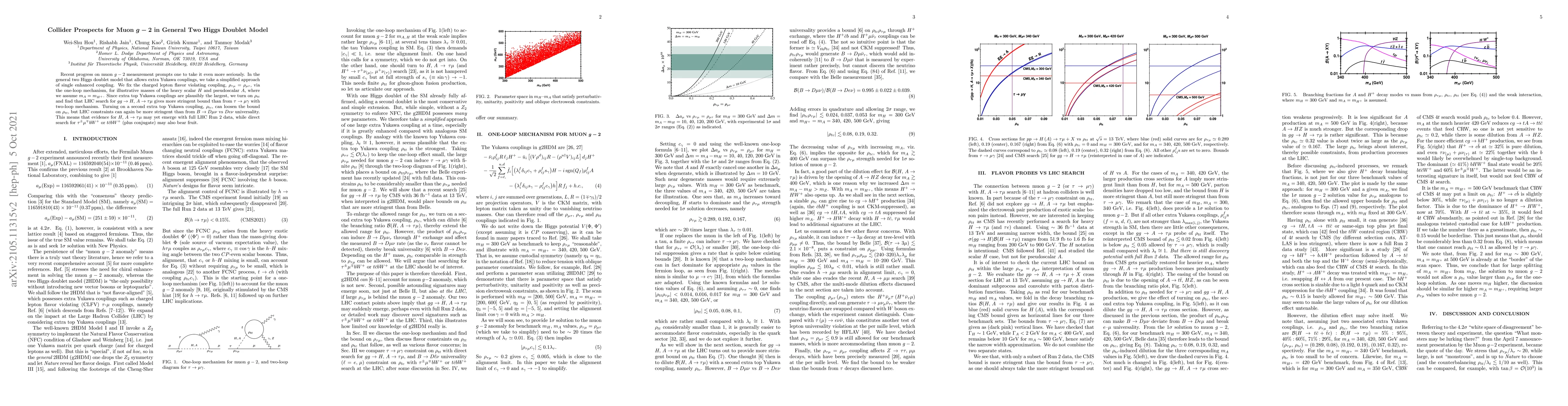Recent progress on muon $g-2$ measurement prompts one to take it even more seriously. In the general two Higgs doublet model that allows extra Yukawa couplings, we take a simplified approach of single enhanced coupling. We fix the charged lepton flavor violating coupling, $\rho_{\tau\mu} = \rho_{\mu\tau}$, via the one-loop mechanism, for illustrative masses of the heavy scalar $H$ and pseudoscalar $A$, where we assume $m_A = m_{H^+}$. Since extra top Yukawa couplings are plausibly the largest, we turn on $\rho_{tt}$ and find that LHC search for $gg \to H,\,A \to \tau\mu$ gives more stringent bound than from $\tau\to \mu\gamma$ with two-loop mechanism. Turning on a second extra top Yukawa coupling, $\rho_{tc}$, can loosen the bound on $\rho_{tt}$, but LHC constraints can again be more stringent than from $B \to D\mu\nu$ vs $De\nu$ universality. This means that evidence for $H,\,A \to \tau\mu$ may yet emerge with full LHC Run 2 data, while direct search for $\tau^\pm\mu^\mp bW^+$ or $t\bar cbW^+$ (plus conjugate) may also bear fruit.