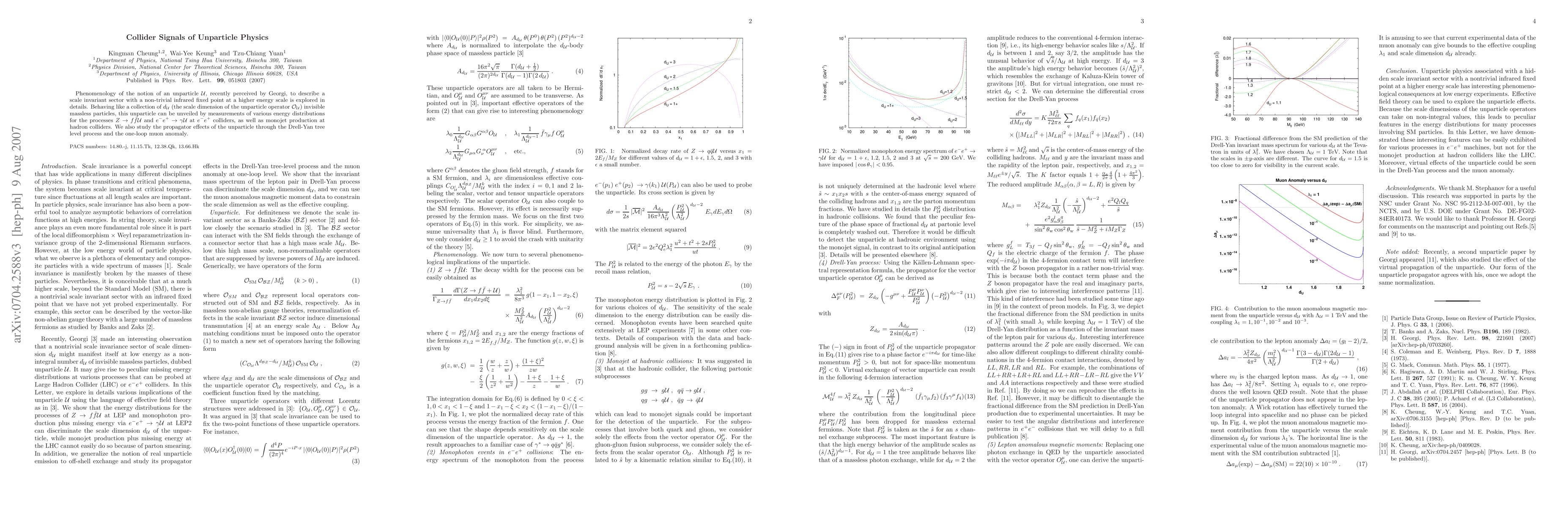 Phenomenology of the notion of an unparticle U, recently perceived by Georgi, to describe a scale invariant sector with a non-trivial infrared fixed point at a higher energy scale is explored in details. Behaving like a collection of d_U (the scale dimension of the unparticle operator O_U) invisible massless particles, this unparticle can be unveiled by measurements of various energy distributions for the processes Z to fermion pair + U and e-e+ to gamma U at e-e+ colliders, as well as mono-jet production at hadron colliders. We also study the propagator effects of the unparticle through the Drell-Yan tree level process and the one-loop muon anomaly.