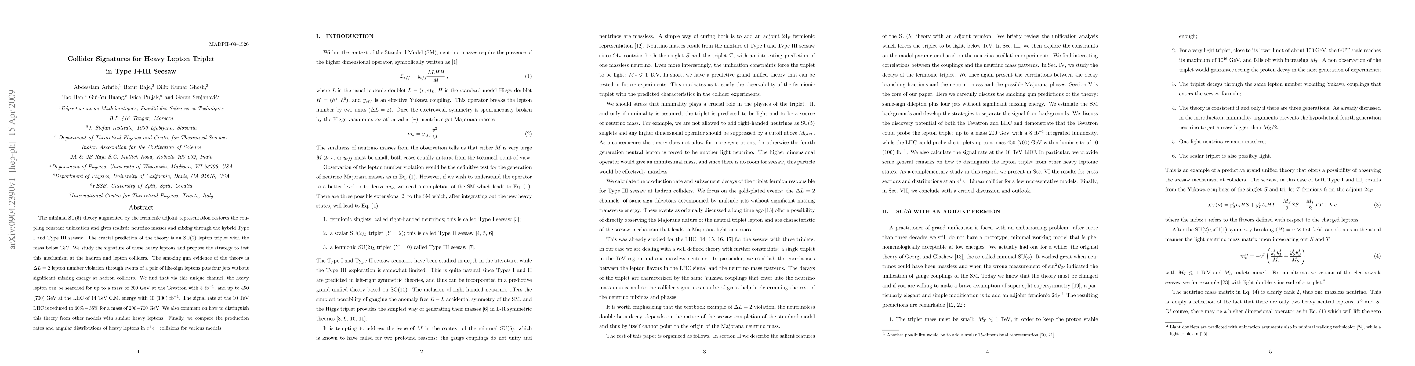 The paper proposes a minimal SU(5) theory with a fermionic adjoint to unify coupling constants and generate realistic neutrino masses via a hybrid Type I and III seesaw. It predicts an SU(2) lepton triplet below TeV, with a smoking gun signature of Delta L=2 lepton number violation through events of a pair of like-sign leptons plus four jets without significant missing energy at hadron colliders. The study suggests search strategies for hadron and lepton colliders, indicating the heavy lepton can be tested up to specific masses at the Tevatron and LHC.