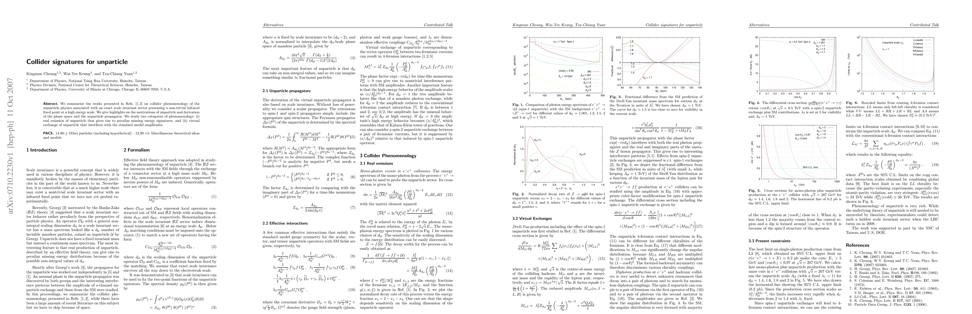 We summarize the works presented in Refs. \cite{1,2} on collider phenomenology of the unparticle physics associated with an exact scale invariant sector possessing a non-trivial infrared fixed point at a high energy scale. We give highlights on the motivations of unparticle and derivation of the phase space and the unparticle propagator. We study two categories of phenomenology: (i) real emission of unparticle that gives rise to peculiar missing energy signatures, and (ii) virtual exchange of unparticle that interferes with the standard model amplitudes.