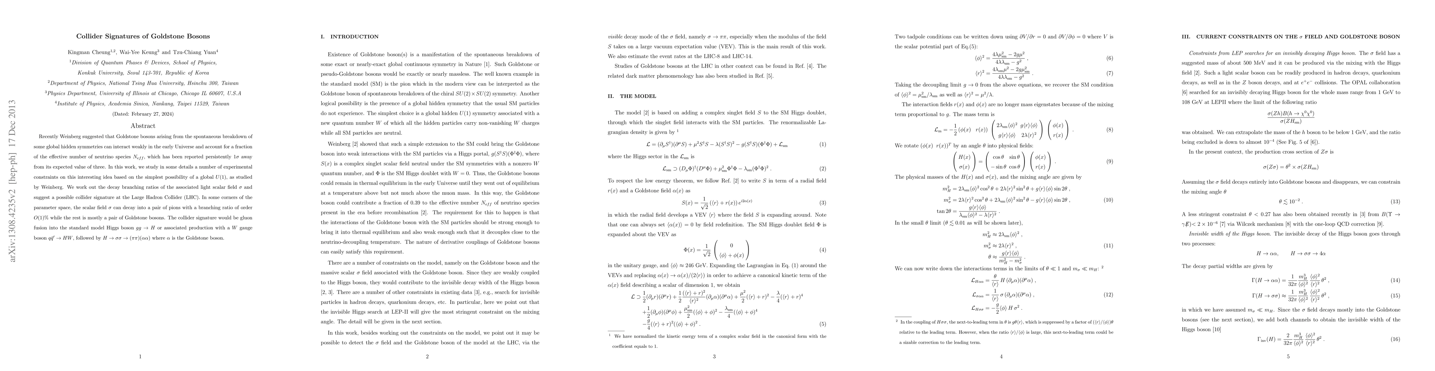 Recently Weinberg suggested that Goldstone bosons arising from the spontaneous breakdown of some global hidden symmetries can interact weakly in the early Universe and account for a fraction of the effective number of neutrino species N_eff, which has been reported persistently 1 \sigma away from its expected value of three. In this work, we study in some details a number of experimental constraints on this interesting idea based on the simplest possibility of a global U(1), as studied by Weinberg. We work out the decay branching ratios of the associated light scalar field $\sigma$ and suggest a possible collider signature at the Large Hadron Collider (LHC). In some corners of the parameter space, the scalar field \sigma can decay into a pair of pions with a branching ratio of order O(1)% while the rest is mostly a pair of Goldstone bosons. The collider signature would be gluon fusion into the standard model Higgs boson gg -> H or associated production with a W gauge boson q q'-bar -> H W, followed by H -> \sigma \sigma -> (\pi\pi) (\alpha\alpha), where \alpha is the Goldstone boson.