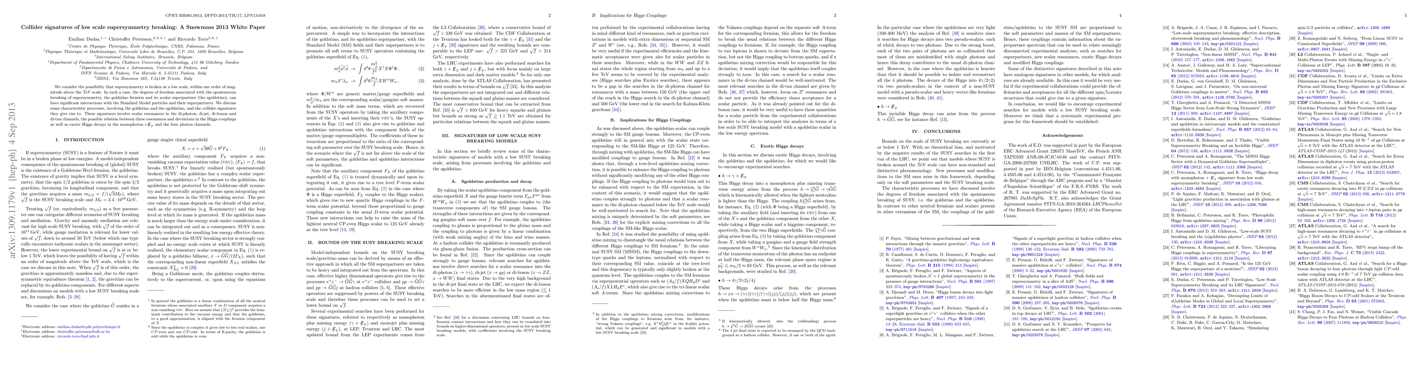 This paper explores low-scale supersymmetry breaking scenarios, focusing on collider signatures involving goldstino and sgoldstino interactions. It highlights potential scalar resonances in various channels, including di-photon and di-jet, and discusses possible deviations in Higgs couplings and exotic Higgs decays.