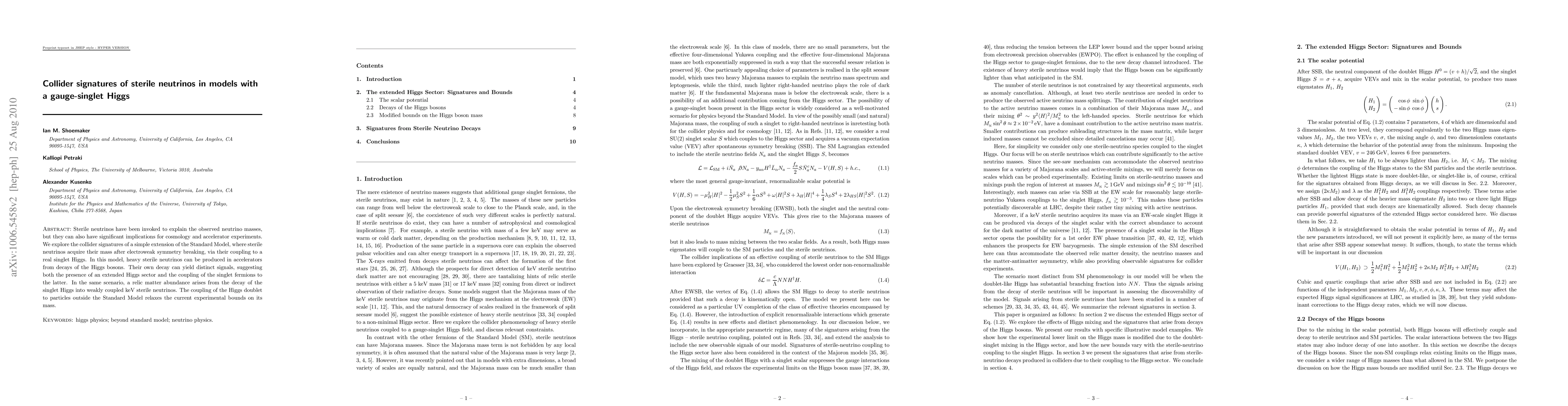 This paper explores the collider signatures of sterile neutrinos in an extended Standard Model with a gauge-singlet Higgs, where heavy sterile neutrinos can be produced via Higgs decay and their decay yields distinct signals. The model also predicts a relic abundance of keV sterile neutrinos from singlet Higgs decay, potentially relaxing current experimental bounds on the Higgs mass.