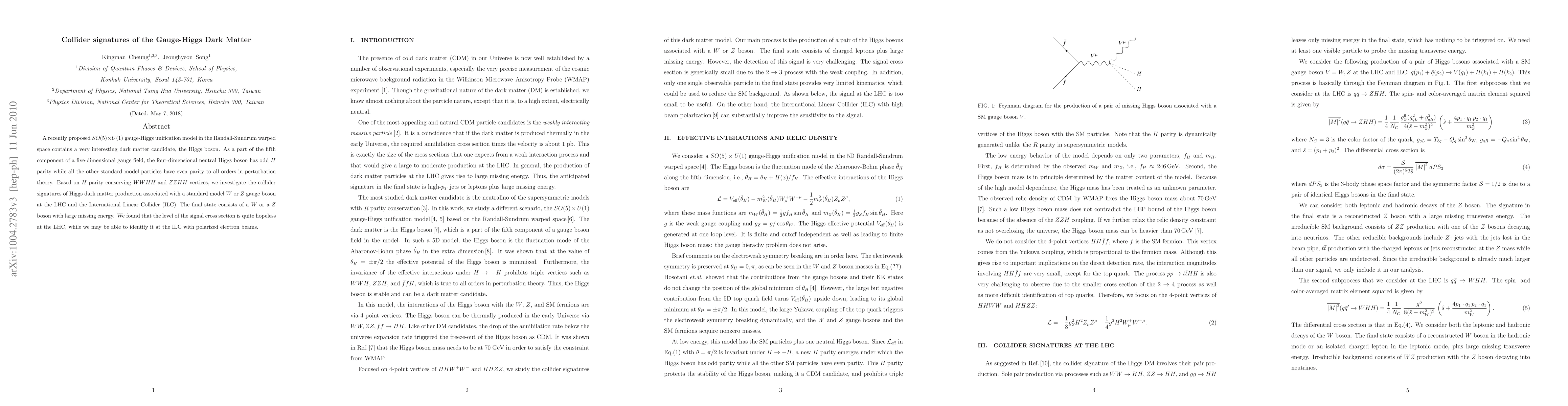 A recently proposed SO(5)xU(1) gauge-Higgs unification model in the Randall-Sundrum warped space contains a very interesting dark matter candidate, the Higgs boson. As a part of the fifth component of a five-dimensional gauge field, the four-dimensional neutral Higgs boson has odd H parity while all the other standard model particles have even parity to all orders in perturbation theory. Based on H-parity conserving WWHH and ZZHH vertices, we investigate the collider signatures of Higgs dark matter production associated with a SM W or Z gauge boson at the LHC and the ILC. The final state consists of a W or a Z boson with large missing energy. We found that the level of the signal cross section is quite hopeless at the LHC while we may be able to identify it at the ILC with polarized electron beams.