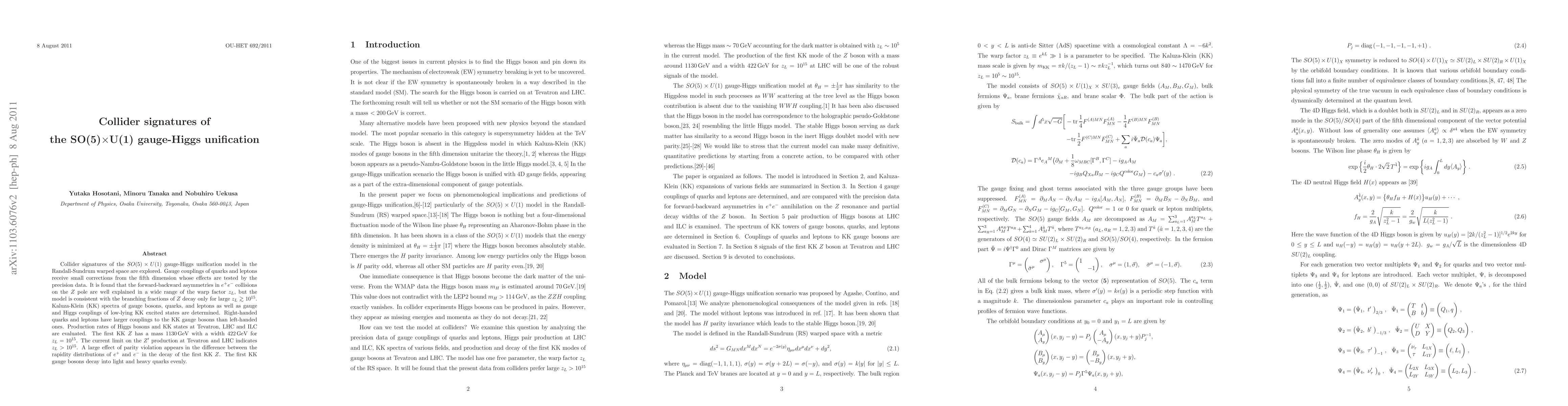 This paper explores collider signatures of the $SO(5) \times U(1)$ gauge-Higgs unification model in Randall-Sundrum warped space, finding that forward-backward asymmetries in $e^+e^-$ collisions on the $Z$ pole are well explained, but the model requires a large warp factor $z_L \sim 10^{15}$ to be consistent with $Z$ decay branching fractions.