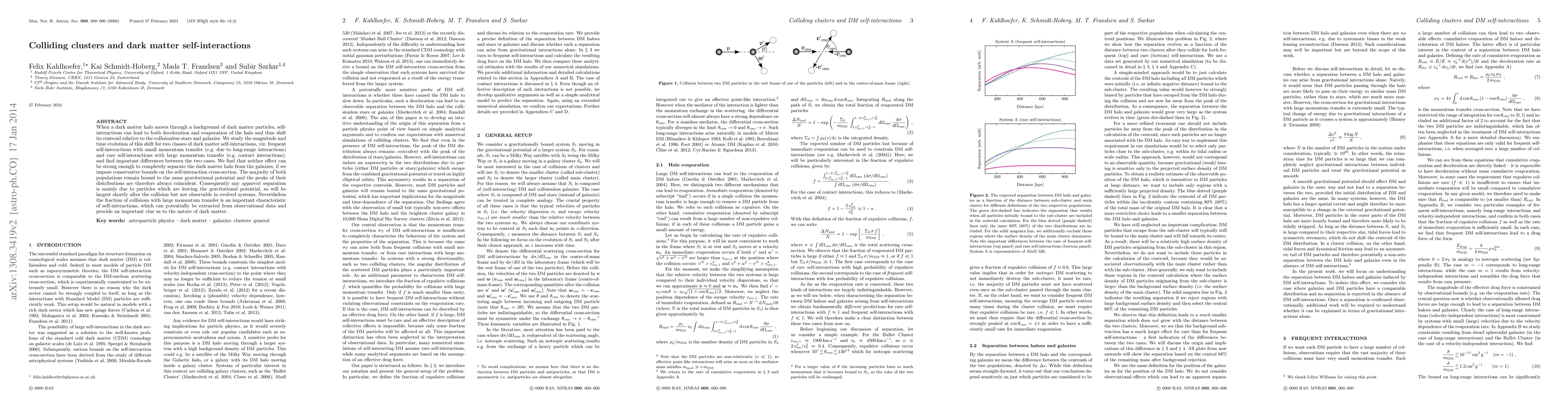 When a dark matter halo moves through a background of dark matter particles, self-interactions can lead to both deceleration and evaporation of the halo and thus shift its centroid relative to the collisionless stars and galaxies. We study the magnitude and time evolution of this shift for two classes of dark matter self-interactions, viz. frequent self-interactions with small momentum transfer (e.g. due to long-range interactions) and rare self-interactions with large momentum transfer (e.g. contact interactions), and find important differences between the two cases. We find that neither effect can be strong enough to completely separate the dark matter halo from the galaxies, if we impose conservative bounds on the self-interaction cross-section. The majority of both populations remain bound to the same gravitational potential and the peaks of their distributions are therefore always coincident. Consequently any apparent separation is mainly due to particles which are leaving the gravitational potential, so will be largest shortly after the collision but not observable in evolved systems. Nevertheless the fraction of collisions with large momentum transfer is an important characteristic of self-interactions, which can potentially be extracted from observational data and provide an important clue as to the nature of dark matter.