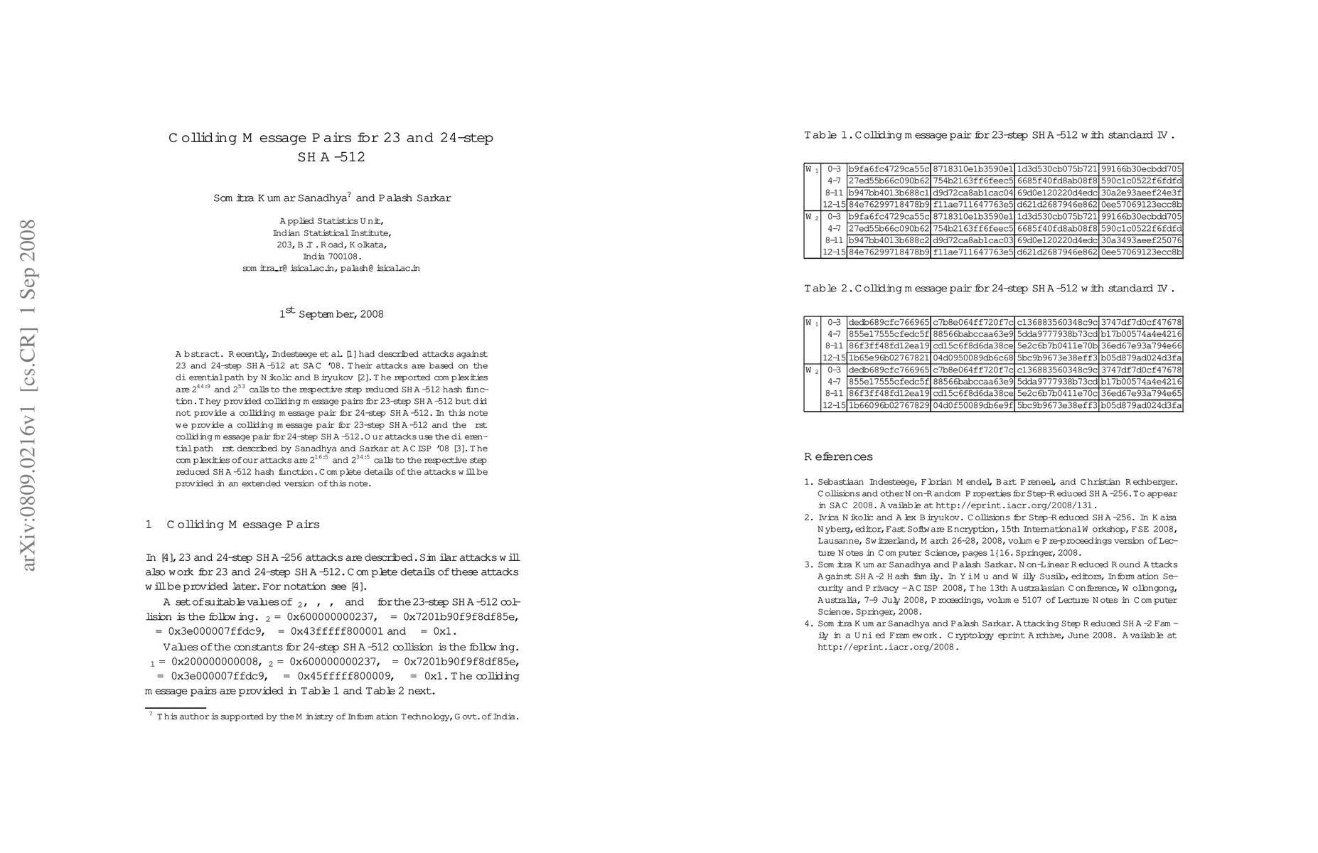 This paper presents new colliding message pairs for 23-step and 24-step SHA-512, improving upon previous attacks with complexities of $2^{16.5}$ and $2^{34.5}$ calls, respectively. The authors utilize the differential path method introduced by Sanadhya and Sarkar.