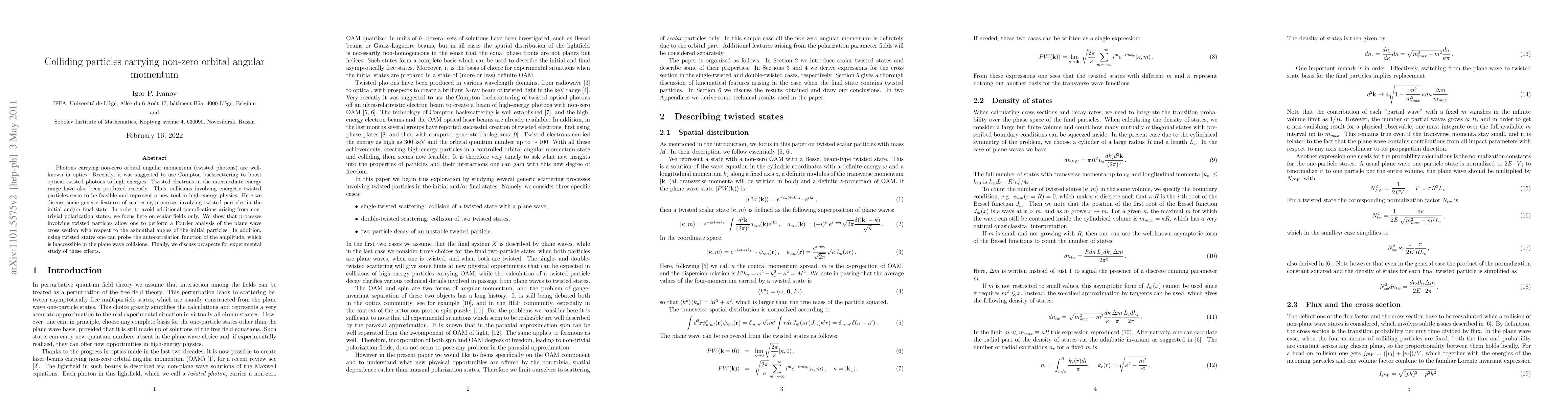 Photons carrying non-zero orbital angular momentum (twisted photons) are well-known in optics. Recently, it was suggested to use Compton backscattering to boost optical twisted photons to high energies. Twisted electrons in the intermediate energy range have also been produced recently. Thus, collisions involving energetic twisted particles seem to be feasible and represent a new tool in high-energy physics. Here we discuss some generic features of scattering processes involving twisted particles in the initial and/or final state. In order to avoid additional complications arising from non-trivial polarization states, we focus here on scalar fields only. We show that processes involving twisted particles allow one to perform a Fourier analysis of the plane wave cross section with respect to the azimuthal angles of the initial particles. In addition, using twisted states one can probe the autocorrelation function of the amplitude, which is inaccessible in the plane wave collisions. Finally, we discuss prospects for experimental study of these effects.