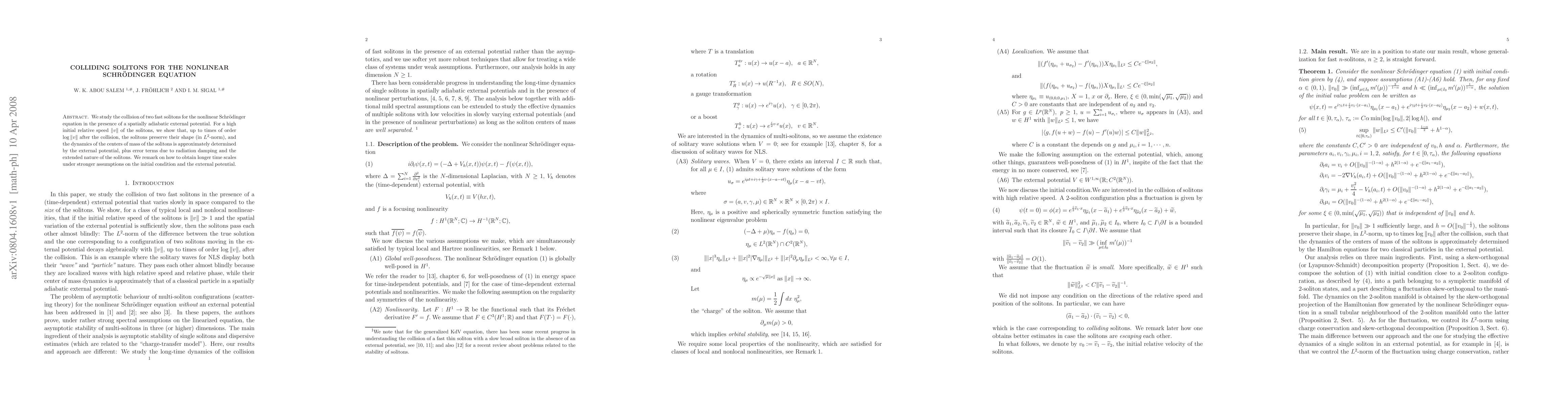We study the collision of two fast solitons for the nonlinear Schr\"odinger equation in the presence of a spatially adiabatic external potential. For a high initial relative speed $\|v\|$ of the solitons, we show that, up to times of order $\log\|v\|$ after the collision, the solitons preserve their shape (in $L^2$-norm), and the dynamics of the centers of mass of the solitons is approximately determined by the external potential, plus error terms due to radiation damping and the extended nature of the solitons. We remark on how to obtain longer time scales under stronger assumptions on the initial condition and the external potential.