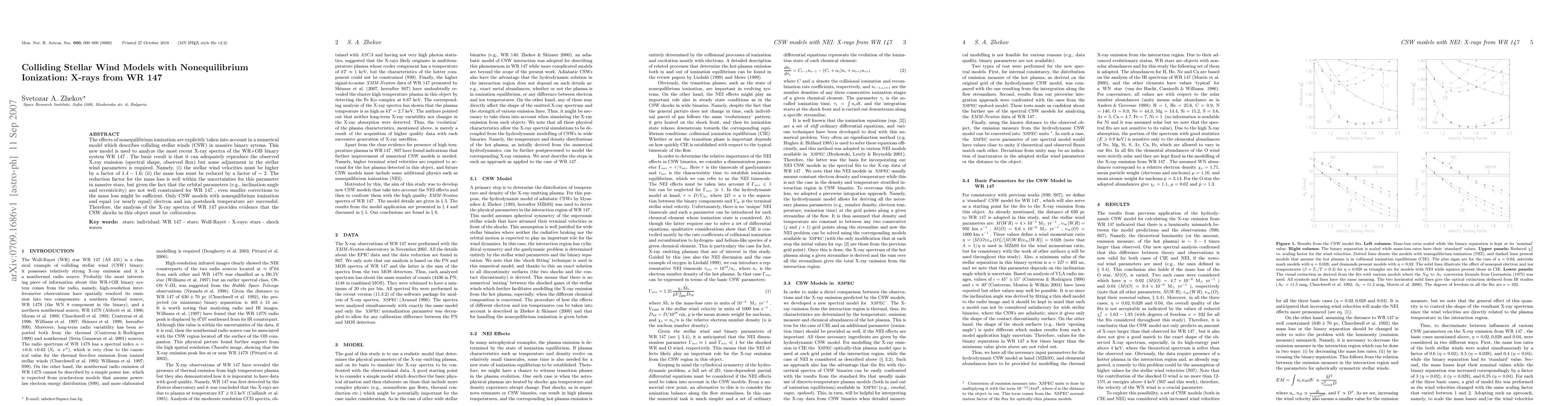 This paper presents a numerical model incorporating nonequilibrium ionization to study colliding stellar winds in massive binary systems, specifically analyzing WR 147. The model successfully reproduces observed X-ray spectra but requires adjustments to stellar wind velocities and mass loss, suggesting that shocks in WR 147 are collisionless.