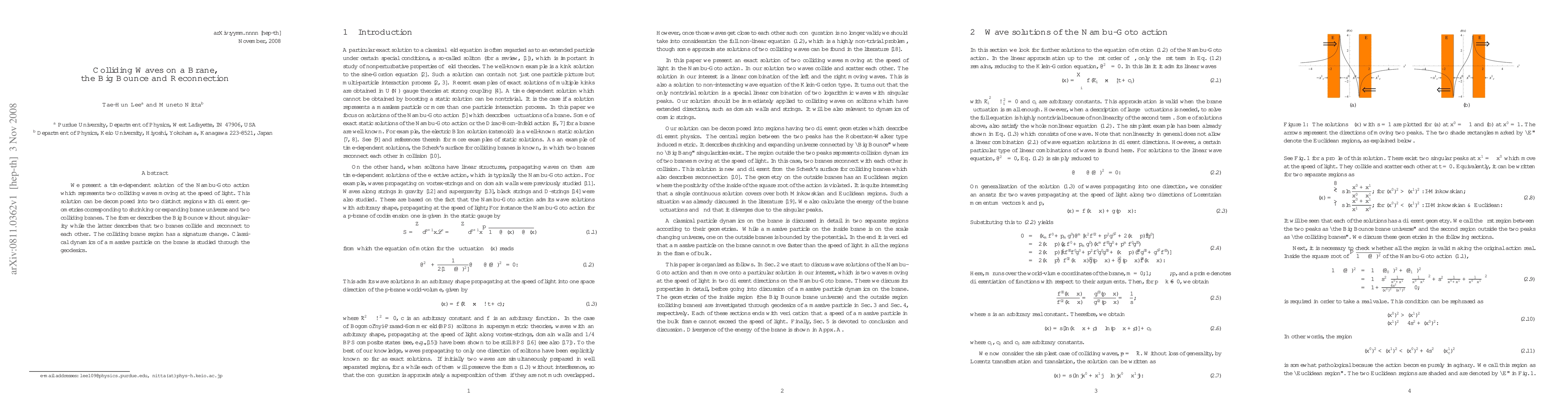We present a time-dependent solution of the Nambu-Goto action which represents two colliding waves moving at the speed of light. This solution can be decomposed into two distinct regions with different geometries corresponding to shrinking or expanding brane universe and two colliding branes. The former describes the Big Bounce without singularity while the latter describes that two branes collide and reconnect to each other. The colliding brane region has a signature change. Classical dynamics of a massive particle on the brane is studied through the geodesics.