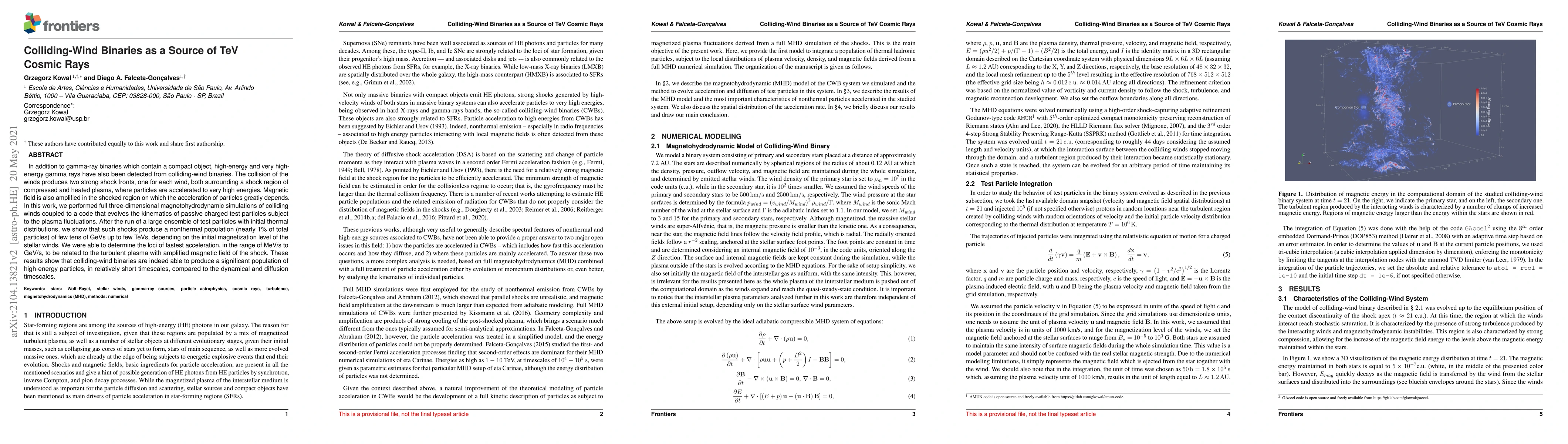 In addition to gamma-ray binaries which contain a compact object, high-energy and very high-energy gamma rays have also been detected from colliding-wind binaries. The collision of the winds produces two strong shock fronts, one for each wind, both surrounding a shock region of compressed and heated plasma, where particles are accelerated to very high energies. Magnetic field is also amplified in the shocked region on which the acceleration of particles greatly depends. In this work, we performed full three-dimensional magnetohydrodynamic simulations of colliding winds coupled to a code that evolves the kinematics of passive charged test particles subject to the plasma fluctuations. After the run of a large ensemble of test particles with initial thermal distributions, we show that such shocks produce a nonthermal population (nearly 1% of total particles) of few tens of GeVs up to few TeVs, depending on the initial magnetization level of the stellar winds. We were able to determine the loci of fastest acceleration, in the range of MeV/s to GeV/s, to be related to the turbulent plasma with amplified magnetic field of the shock. These results show that colliding-wind binaries are indeed able to produce a significant population of high-energy particles, in relatively short timescales, compared to the dynamical and diffusion timescales.