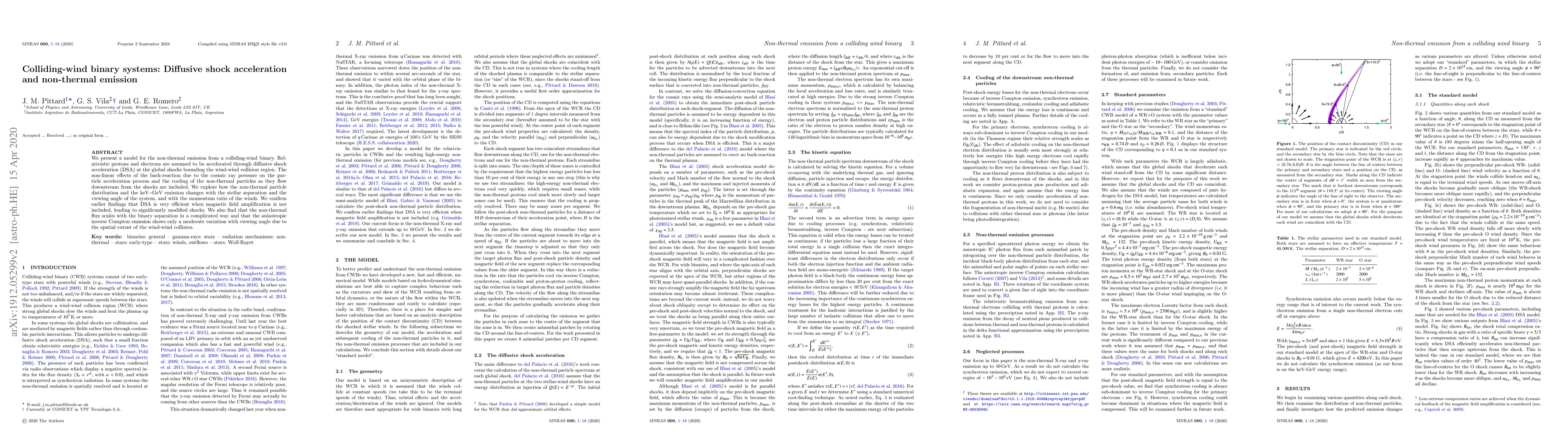 This paper models non-thermal emission from colliding-wind binaries, focusing on diffusive shock acceleration of relativistic particles at global shocks. It examines the impact of stellar separation, viewing angle, and wind momentum ratio on the resulting keV-GeV emission and particle distribution.