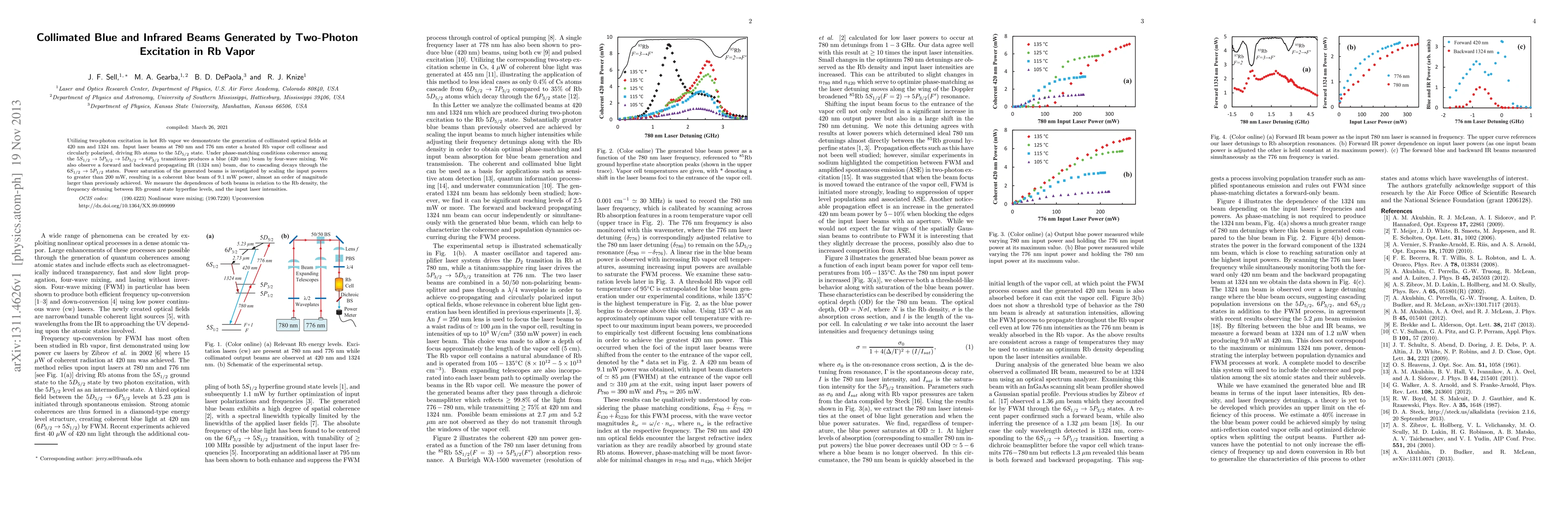 This paper demonstrates the generation of collimated blue and infrared beams via two-photon excitation in hot Rb vapor, achieving significantly higher power outputs for the blue beam compared to previous methods. The process involves four-wave mixing and cascading decays through specific Rb atomic states.