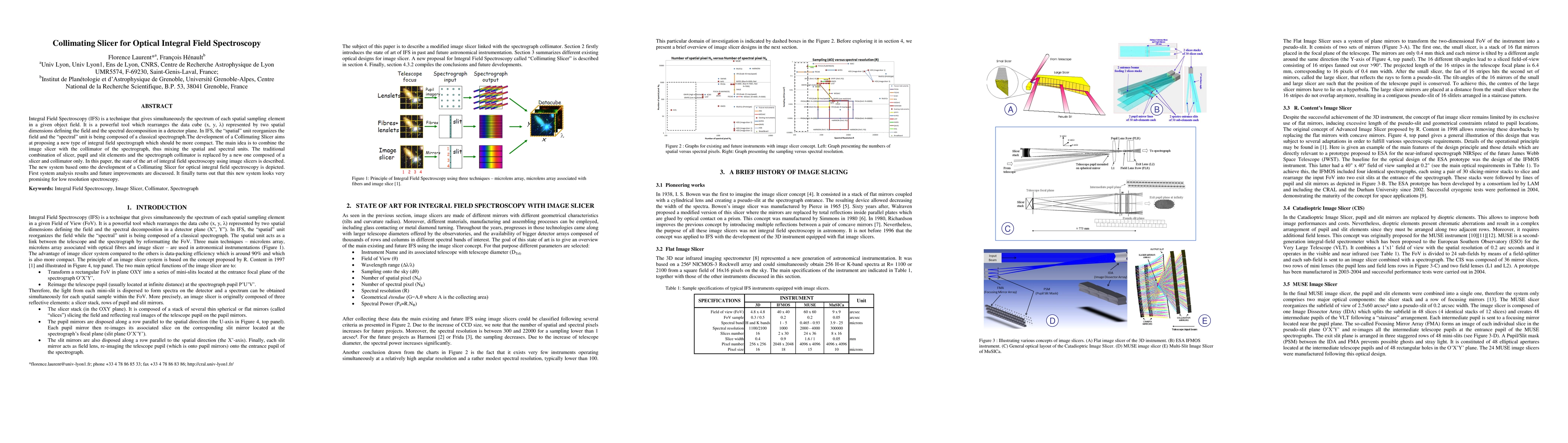 Integral Field Spectroscopy (IFS) is a technique that gives simultaneously the spectrum of each spatial sampling element in a given object field. It is a powerful tool which rearranges the data cube (x, y, lambda) represented by two spatial dimensions defining the field and the spectral decomposition in a detector plane. In IFS, the spatial unit reorganizes the field and the spectral unit is being composed of a classical spectrograph.The development of a Collimating Slicer aims at proposing a new type of integral field spectrograph which should be more compact. The main idea is to combine the image slicer with the collimator of the spectrograph, thus mixing the spatial and spectral units. The traditional combination of slicer, pupil and slit elements and the spectrograph collimator is replaced by a new one composed of a slicer and collimator only. In this paper, the state of the art of integral field spectroscopy using image slicers is described. The new system based onto the development of a Collimating Slicer for optical integral field spectroscopy is depicted. First system analysis results and future improvements are discussed. It finally turns out that this new system looks very promising for low resolution spectroscopy.