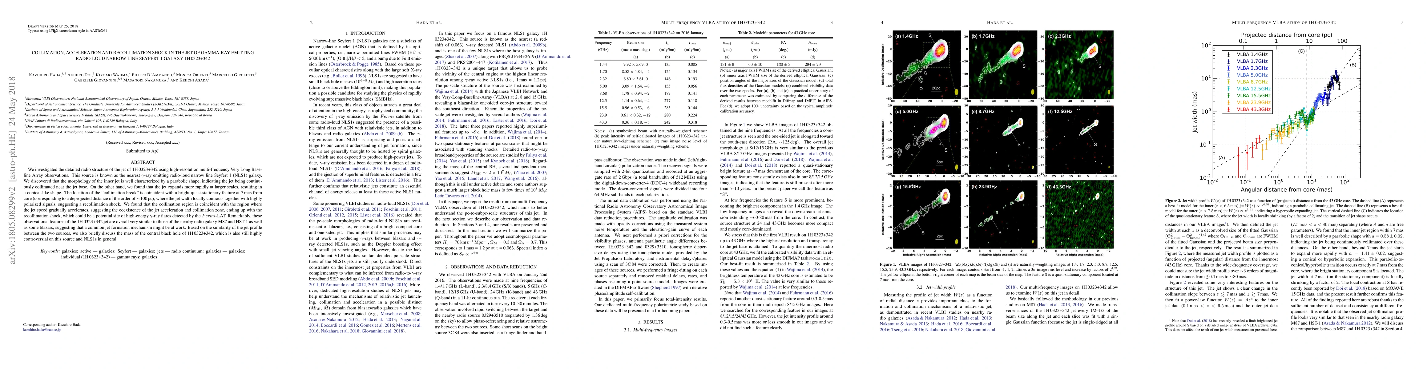 We investigated the detailed radio structure of the jet of 1H 0323+342 using high-resolution multi-frequency Very Long Baseline Array observations. This source is known as the nearest $\gamma$-ray emitting radio-loud narrow-line Seyfert 1 (NLS1) galaxy. We discovered that the morphology of the inner jet is well characterized by a parabolic shape, indicating the jet being continuously collimated near the jet base. On the other hand, we found that the jet expands more rapidly at larger scales, resulting in a conical-like shape. The location of the "collimation break" is coincident with a bright quasi-stationary feature at 7 mas from core (corresponding to a deprojected distance of the order of $\sim$100pc), where the jet width locally contracts together with highly polarized signals, suggesting a recollimation shock. We found that the collimation region is coincident with the region where the jet speed gradually accelerates, suggesting the coexistence of the jet acceleration and collimation zone, ending up with the recollimation shock, which could be a potential site of high-energy $\gamma$-ray flares detected by the Fermi-LAT. Remarkably, these observational features of the 1H 0323+342 jet are overall very similar to those of the nearby radio galaxy M87 and HST-1 as well as some blazars, suggesting that a common jet formation mechanism might be at work. Based on the similarity of the jet profile between the two sources, we also briefly discuss the mass of the central black hole of 1H 0323+342, which is also still highly controversial on this source and NLS1s in general.