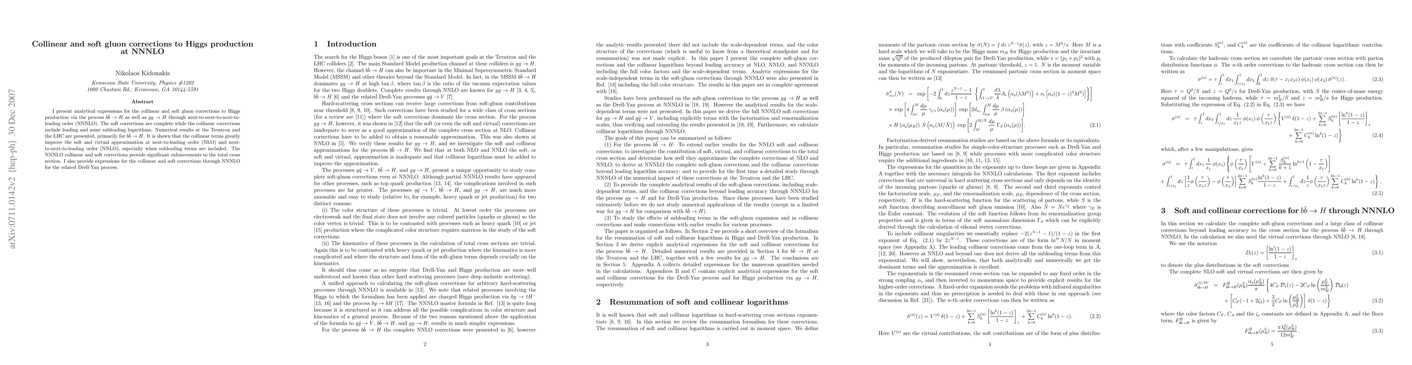 This paper presents analytical expressions for the collinear and soft gluon corrections to Higgs production at next-to-next-to-next-to-leading order (NNNLO) for the processes b bbar -> H and gg -> H. The results show significant improvements in accuracy, especially when subleading terms are included, and provide enhancements to the total cross section for Higgs production at the Tevatron and LHC.