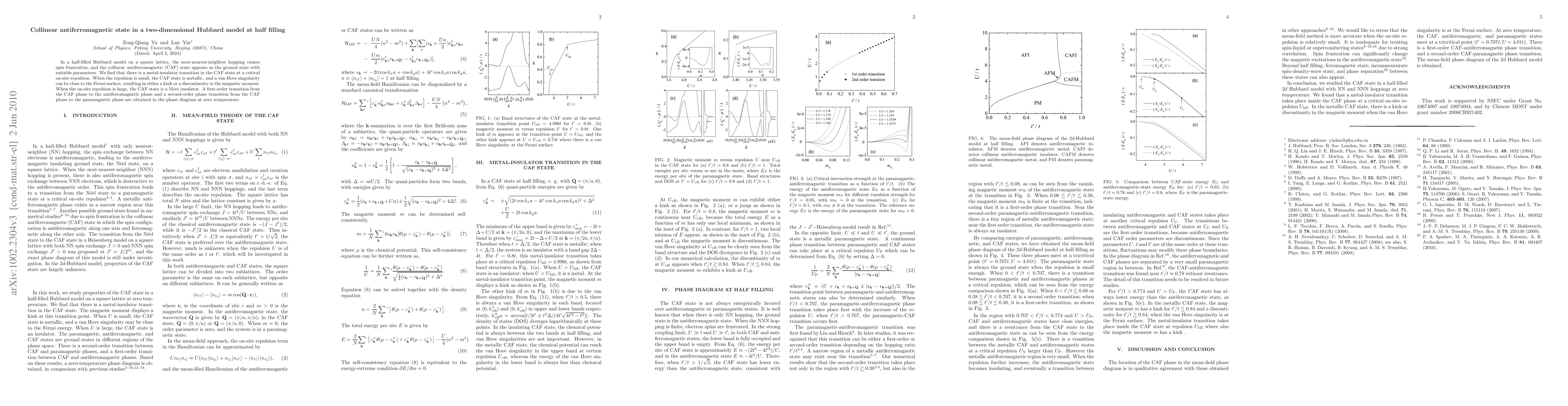 A two-dimensional Hubbard model on a square lattice exhibits a metal-insulator transition in its collinear antiferromagnetic state at half filling, dependent on the critical on-site repulsion.