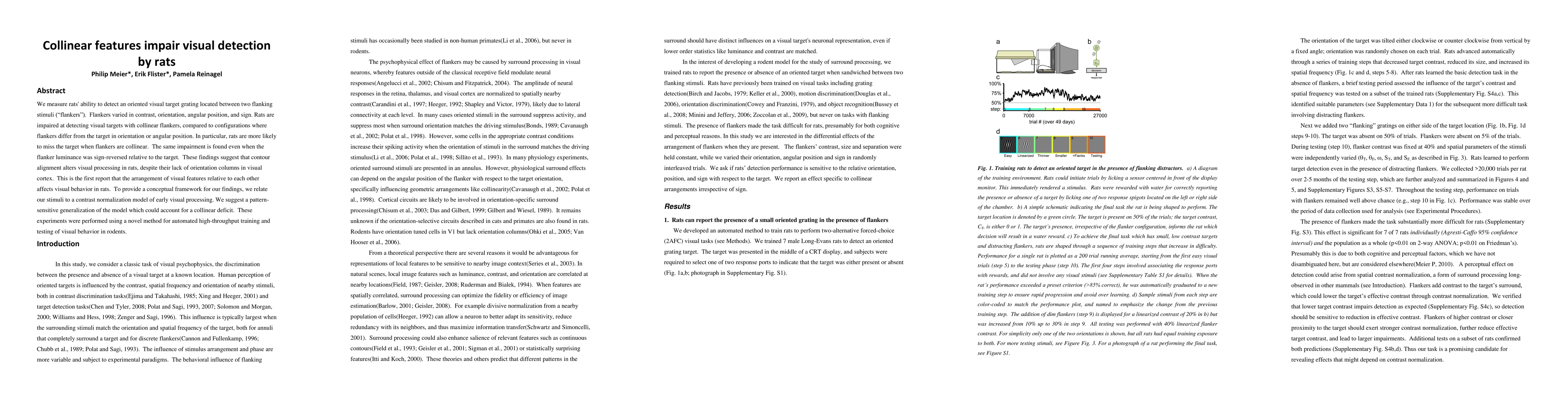 We measure rats' ability to detect an oriented visual target grating located between two flanking stimuli ("flankers"). Flankers varied in contrast, orientation, angular position, and sign. Rats are impaired at detecting visual targets with collinear flankers, compared to configurations where flankers differ from the target in orientation or angular position. In particular, rats are more likely to miss the target when flankers are collinear. The same impairment is found even when the flanker luminance was sign-reversed relative to the target. These findings suggest that contour alignment alters visual processing in rats, despite their lack of orientation columns in visual cortex. This is the first report that the arrangement of visual features relative to each other affects visual behavior in rats. To provide a conceptual framework for our findings, we relate our stimuli to a contrast normalization model of early visual processing. We suggest a pattern-sensitive generalization of the model which could account for a collinear deficit. These experiments were performed using a novel method for automated high-throughput training and testing of visual behavior in rodents.